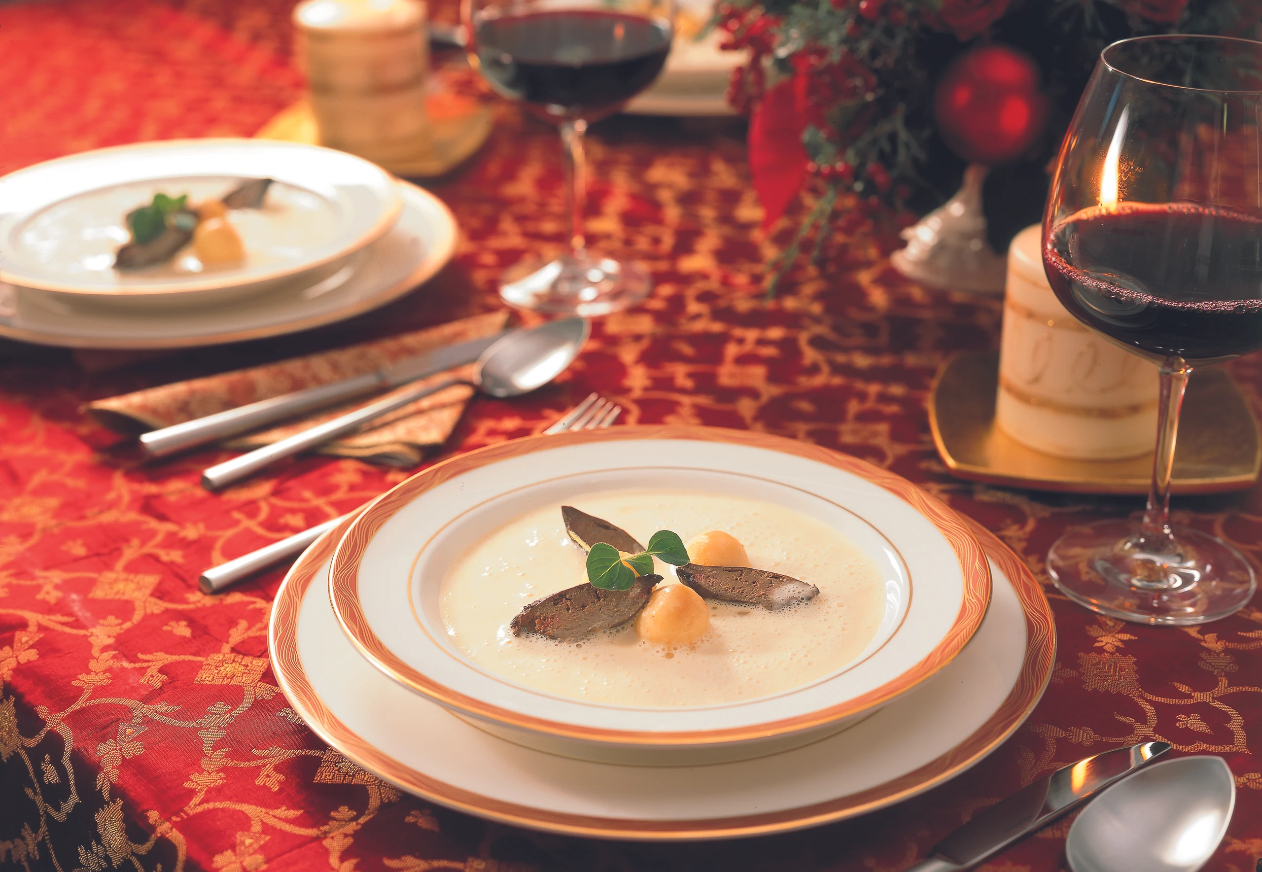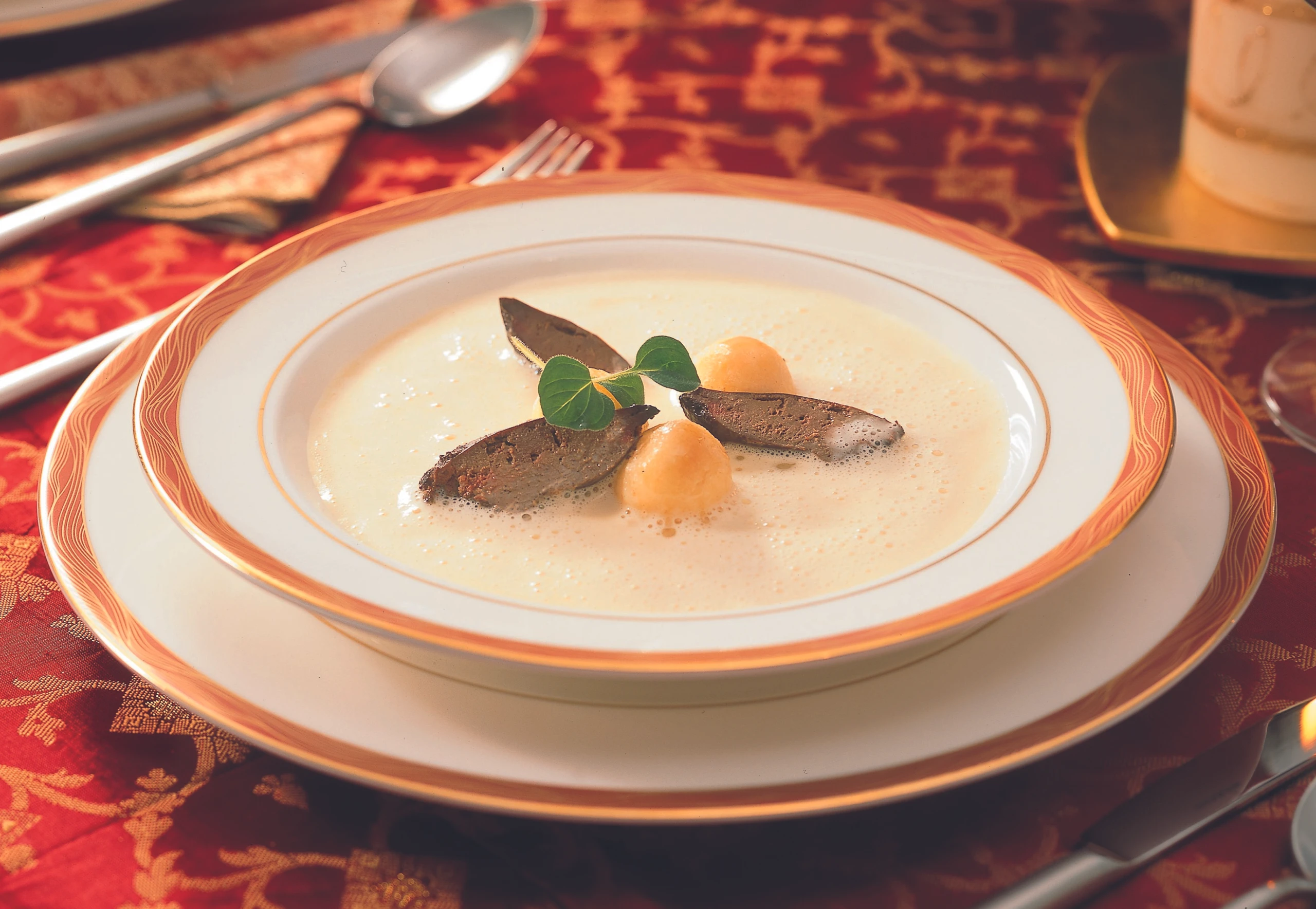 - Gänseklein waschen und in ca. 2 l kaltem, leicht gesalzenem Wasser aufkochen. Zwiebel halbieren, Knoblauch grob hacken und mit einigen Pfefferkörnern, Lorbeerblatt und 1 MS Majoran in den Fond geben. Fond bei schwacher Hitze ca. 1 1/2 Stunden köcheln, aufsteigenden Schaum immer wieder abschöpfen. Fond durch ein feines Sieb gießen – sollte ca. 1 Liter sein, eventuell einkochen oder mit Wasser ergänzen.