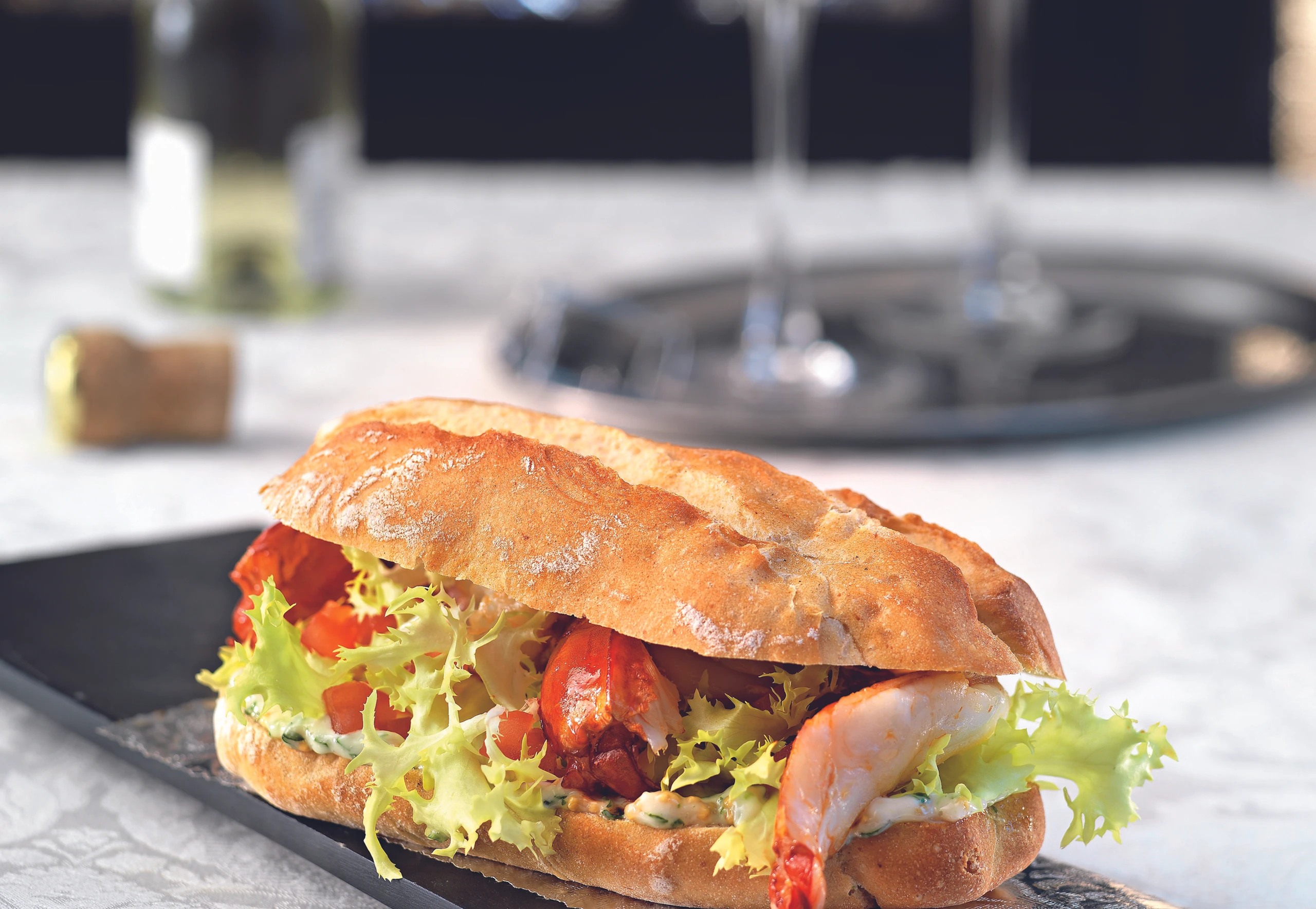- Baguettes aufschneiden, unteren Teil mit Estragon-Mayonnaise bestreichen, mit Frisée und Paradeiswürfel be-legen. Garnelen daraufgeben und mit Mayonnaise beträufeln. Baguettedeckel darauflegen und leicht andrücken.