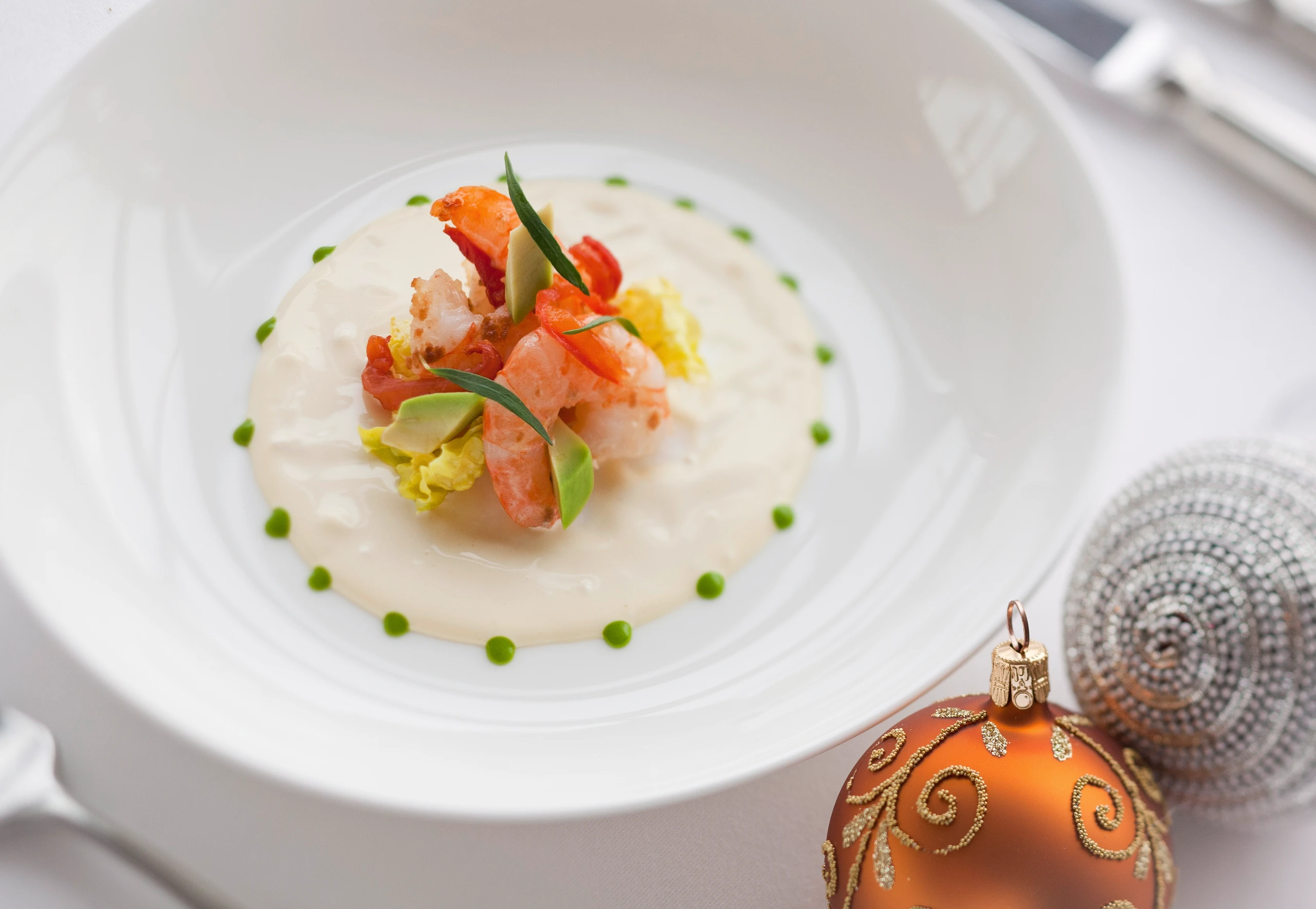 Zuerst beide Saucen anrichten, Garnelen-Cocktail in die Mitte setzen und mit Estragon garniert servieren.