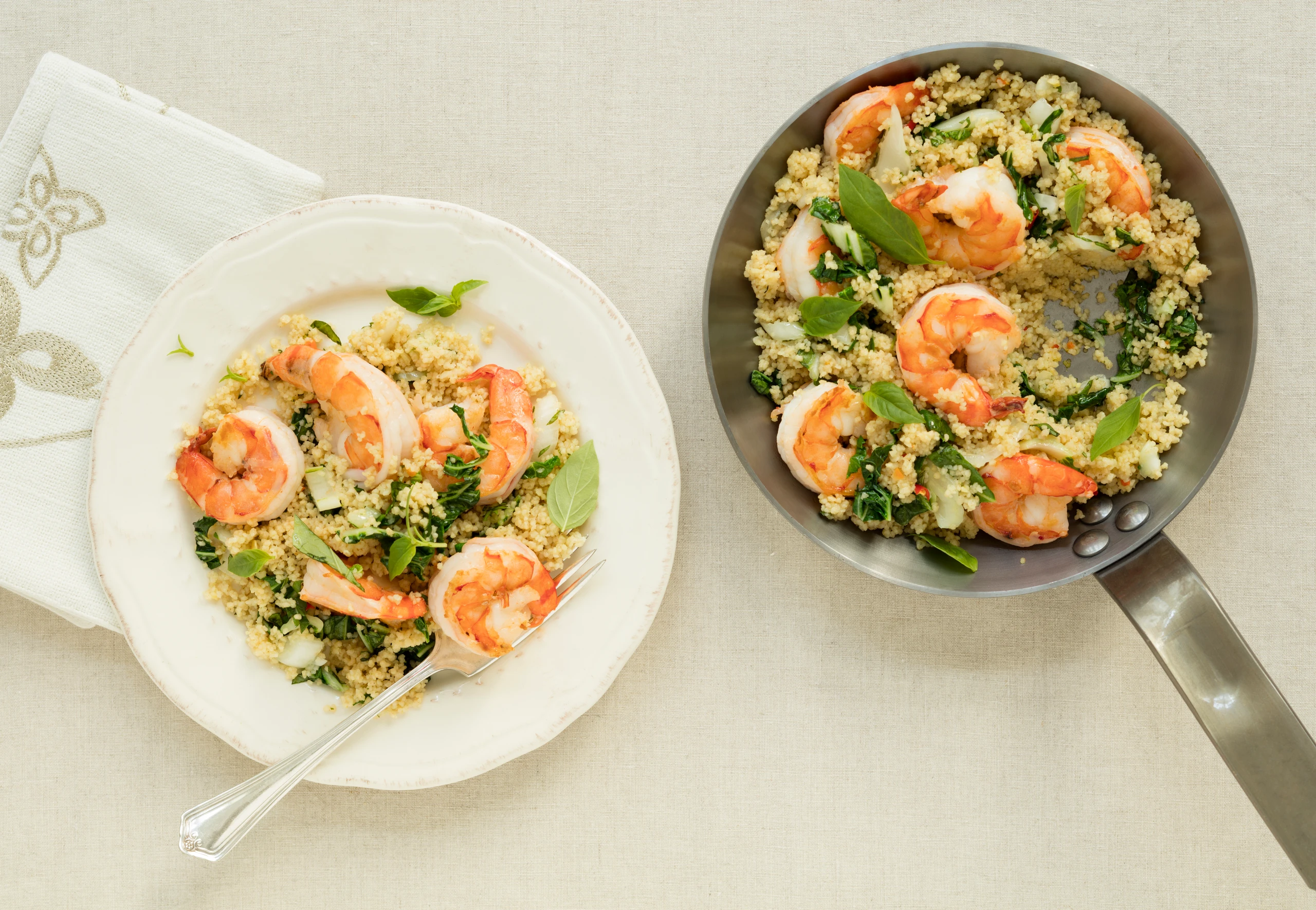 - Couscous mit Salz, Pfeffer und Zitronensaft würzen. Basilikumblätter von den Stielen zupfen und eventuell grob schneiden. Couscous mit den Garnelen vermischen, anrichten und mit Basilikum garniert servieren.