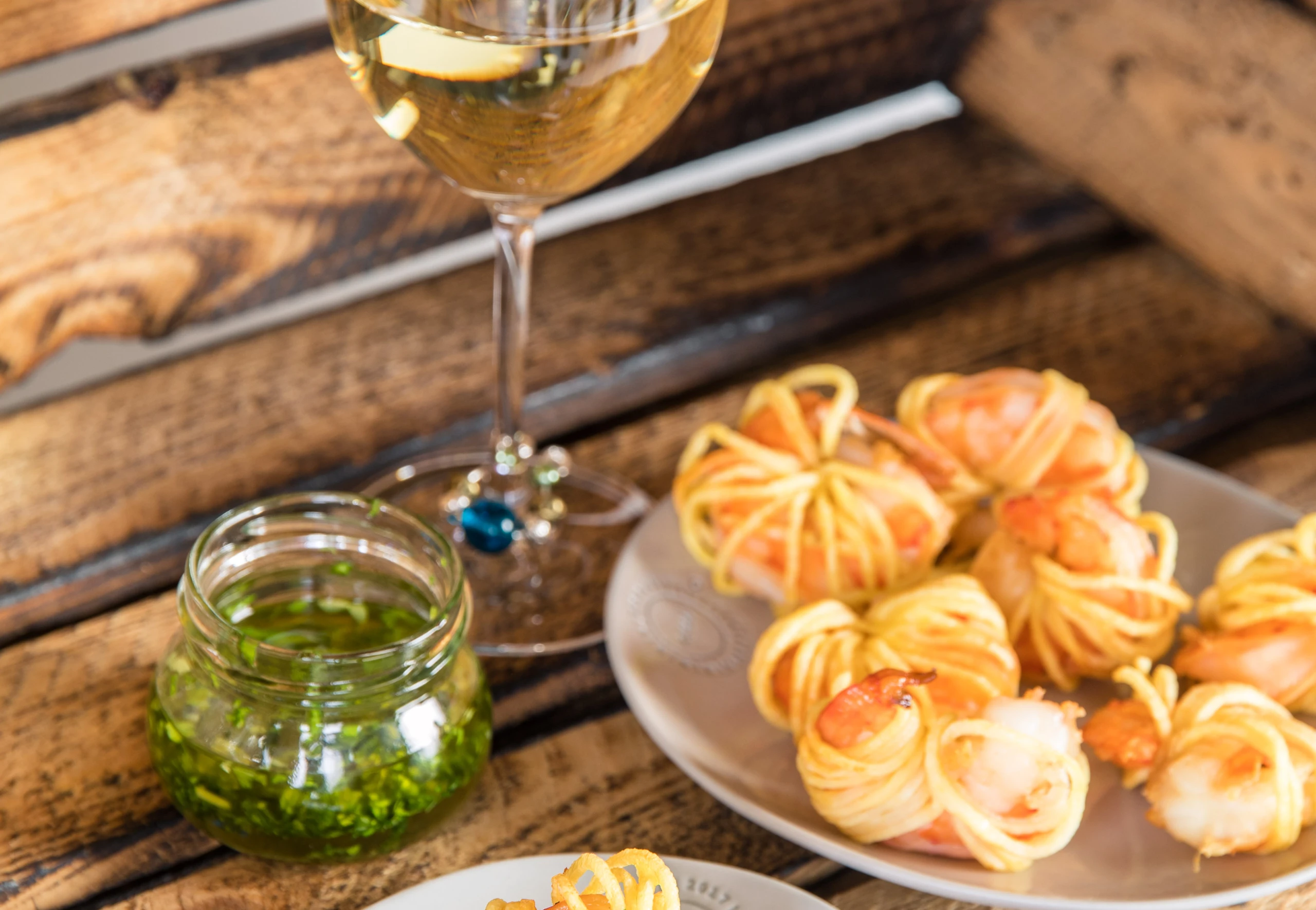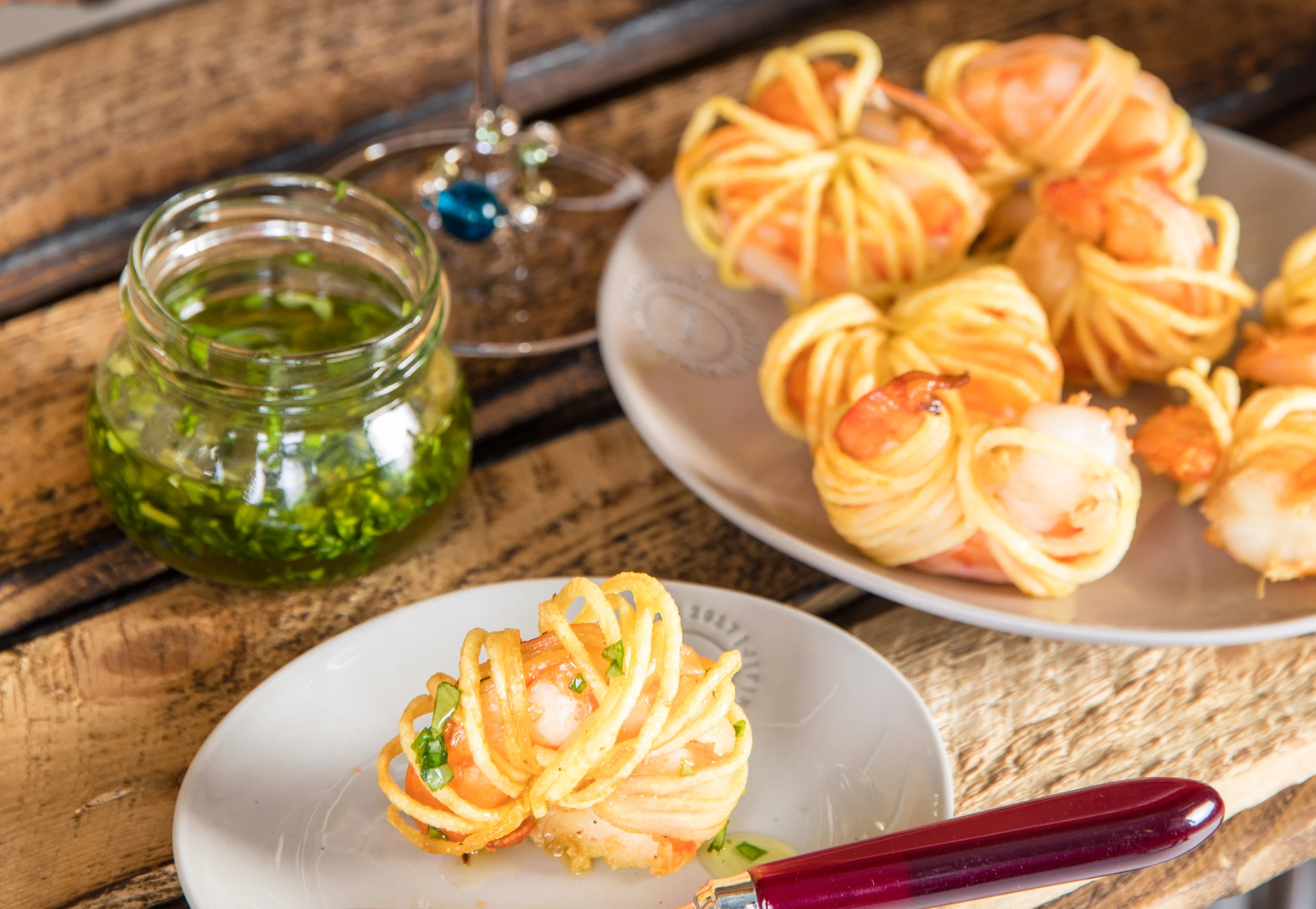 - Erdäpfel schälen und auf einem Spiralschneider in dünne Schnüre schneiden. Garnelen mit Erdäpfelschnüren eng umwickeln. Enden fixieren.