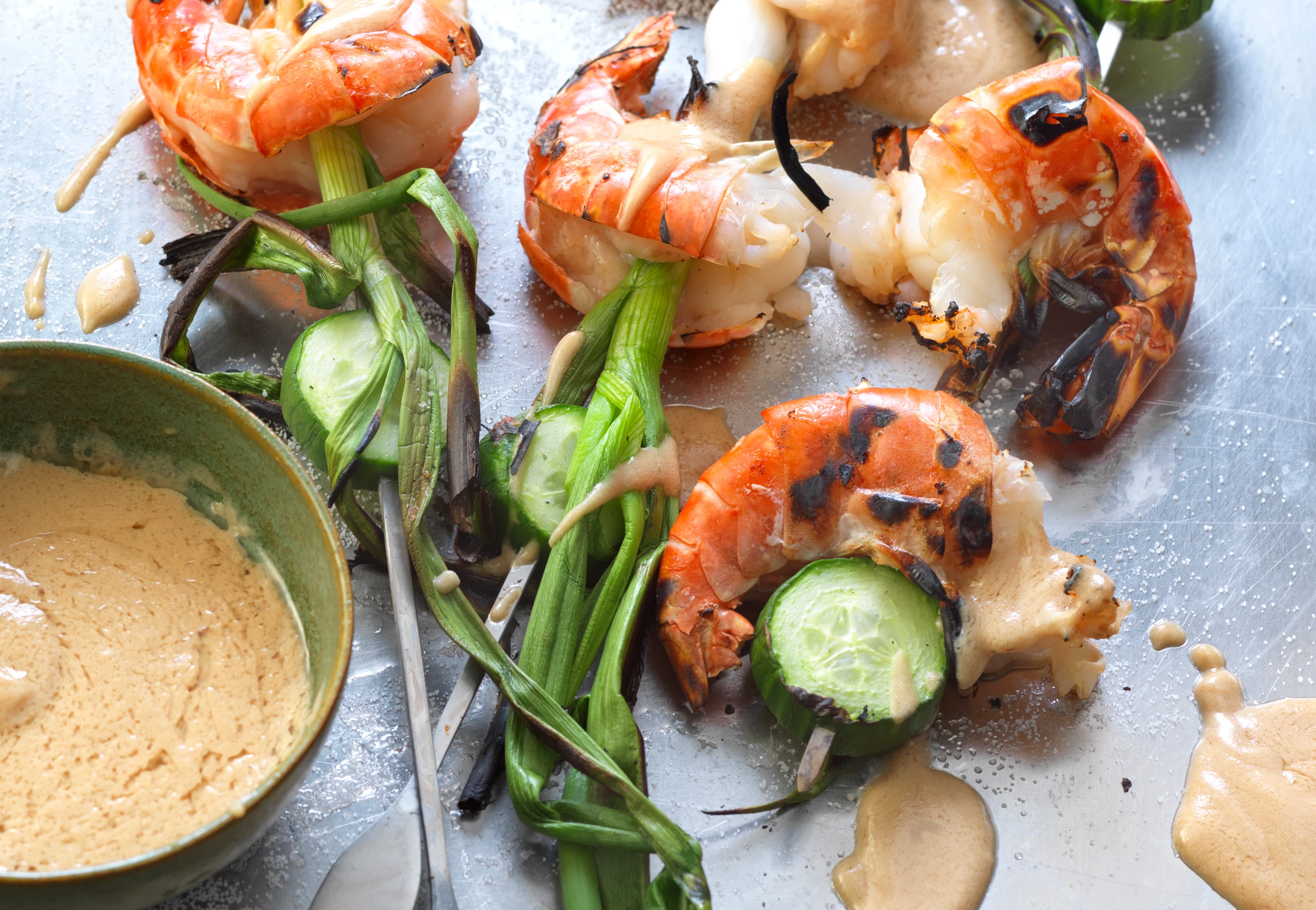 Garnelen-Gurken-Spieße mit Erdnuss-Sauce