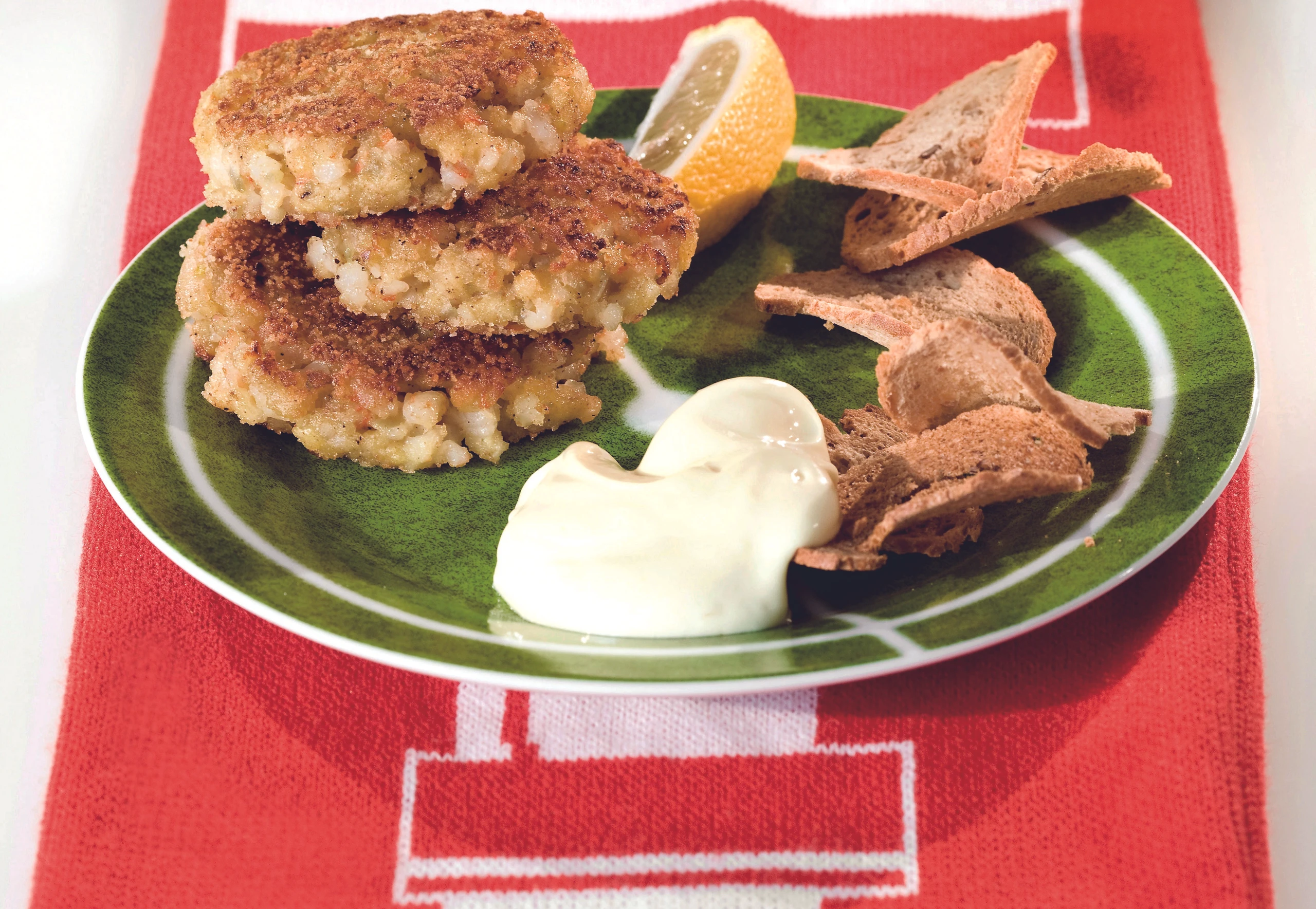Für die Sauce Mayonnaise mit Zitronensaft, Tabasco, Salz und Pfeffer pikant abschmecken. Laibchen mit Sauce und Brot-Chips servieren.