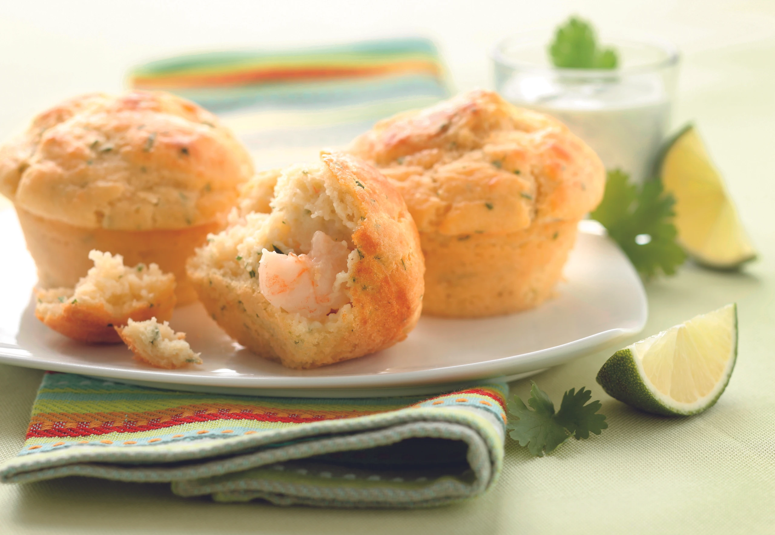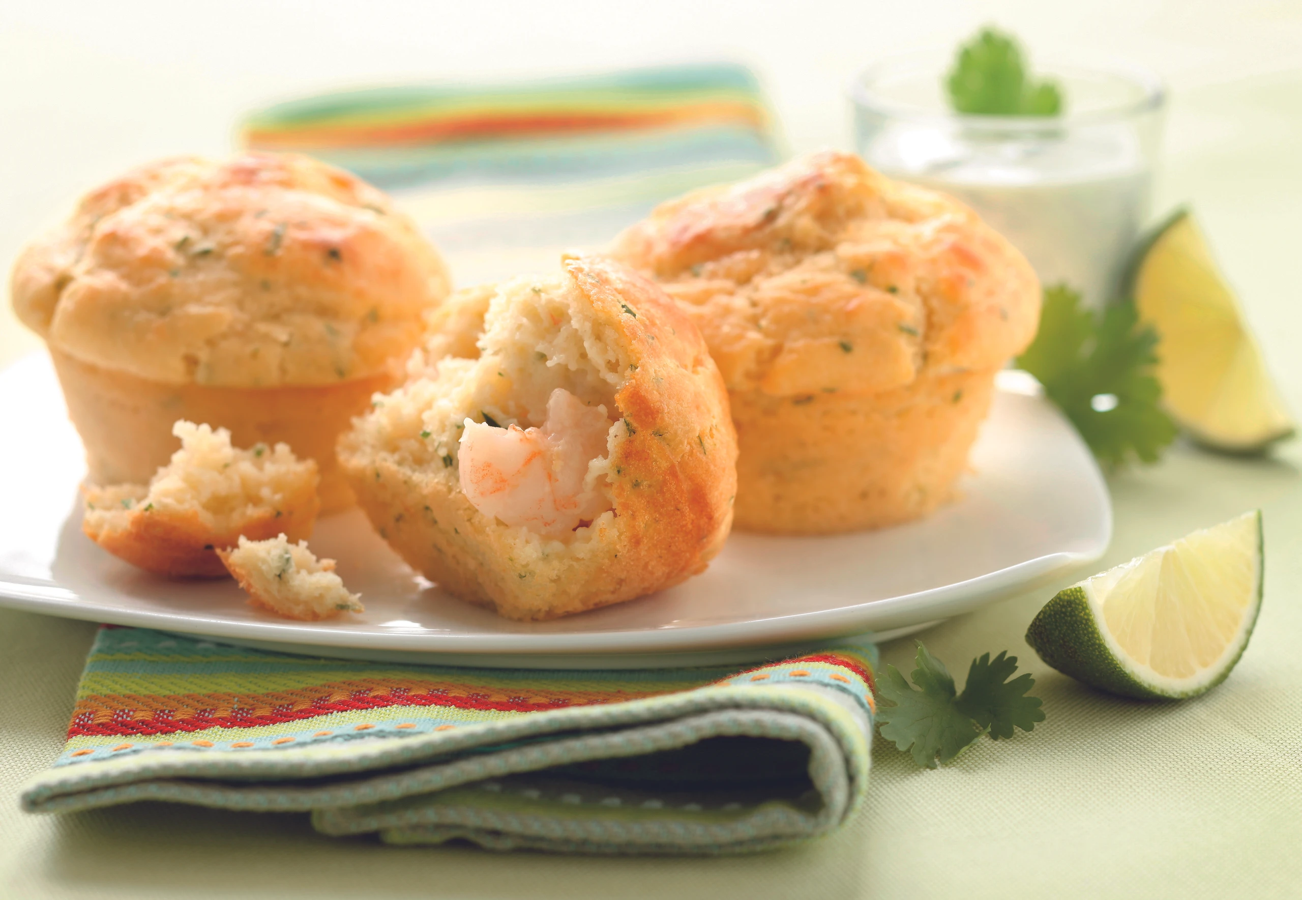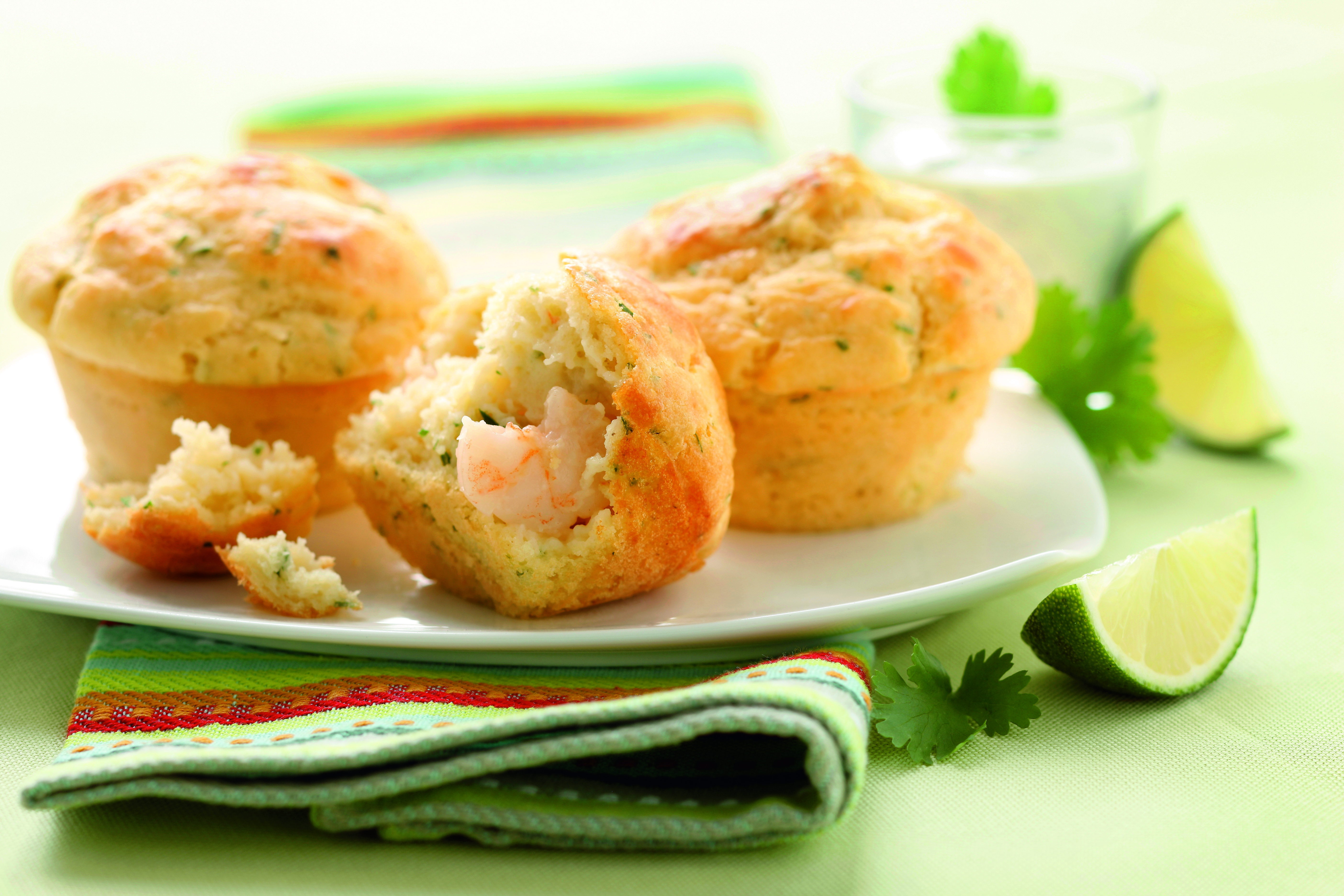 Mehl mit Backpulver ver-sieben. Garnelen quer halbieren oder dritteln. Parmesan mit Petersilie vermischen. Eier, 1/2 TL Salz und wenig Pfeffer mit dem Schneebesen ver-rühren, Öl, dann Milch unter kräftigem Rühren langsam zu-gießen. Mehlmischung, Parme-sanmischung und Garnelen einrühren.