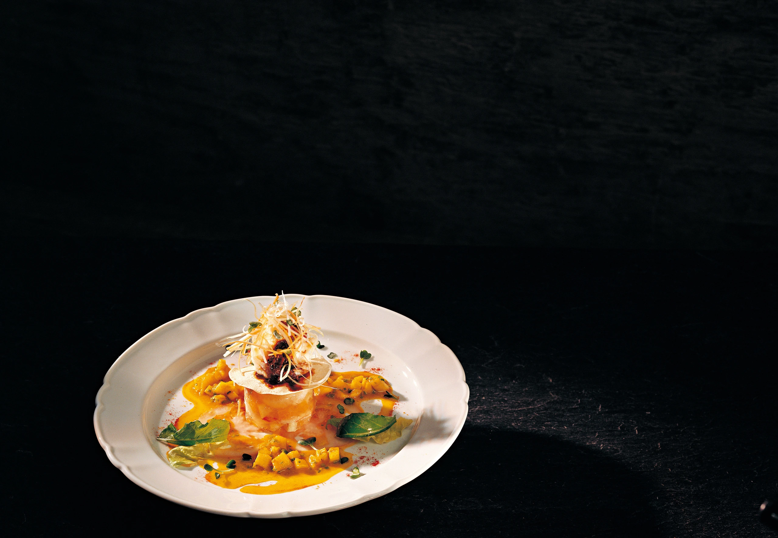 Inzwischen kann man sehr gut die gebackenen Strudelblätter, die süß-saure Sauce, die Gemüsestreifen und die Ananas-Curry-Vinaigrette zubereiten, die man zu den Sülzchen seviert.