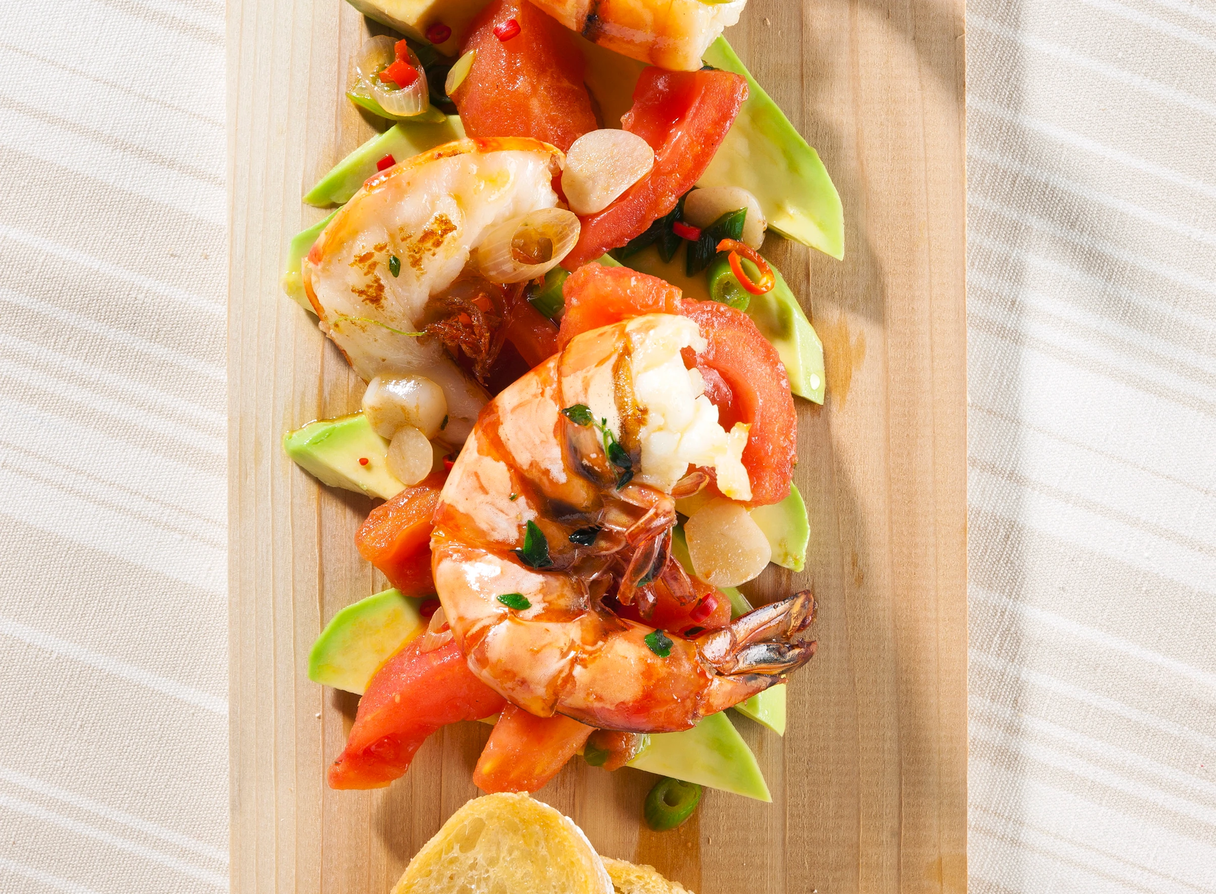 Garnelen horizontal durchschneiden. Paradeiser in Spalten schneiden, Kerne entfernen. Jungzwiebeln putzen und in 0,5 cm dicke Scheiben schneiden. Avocados rundum bis zum Kern einschneiden, die Hälften verdrehen und abheben. Kern entfernen. Fruchtfleisch schälen und in Längsscheiben schneiden.