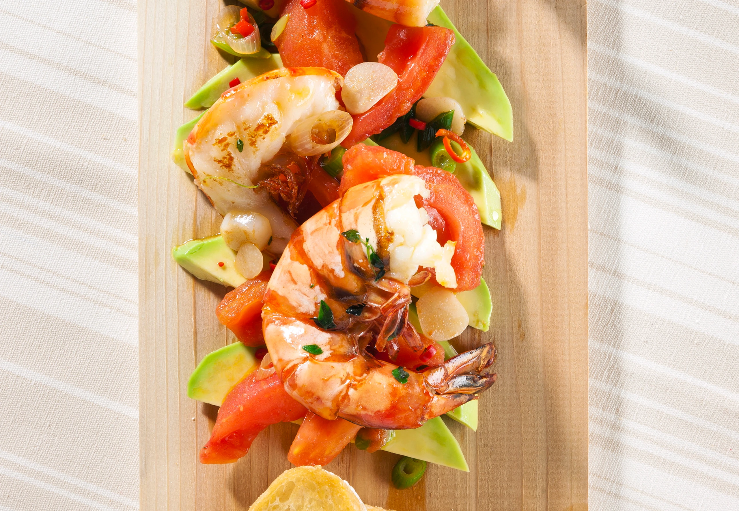 - Garnelen horizontal durchschneiden. Paradeiser in Spalten schneiden, Kerne entfernen. Jungzwiebeln putzen und in 0,5 cm dicke Scheiben schneiden. Avocados rundum bis zum Kern einschneiden, die Hälften verdrehen und abheben. Kern entfernen. Fruchtfleisch schälen und in Längsscheiben schneiden.