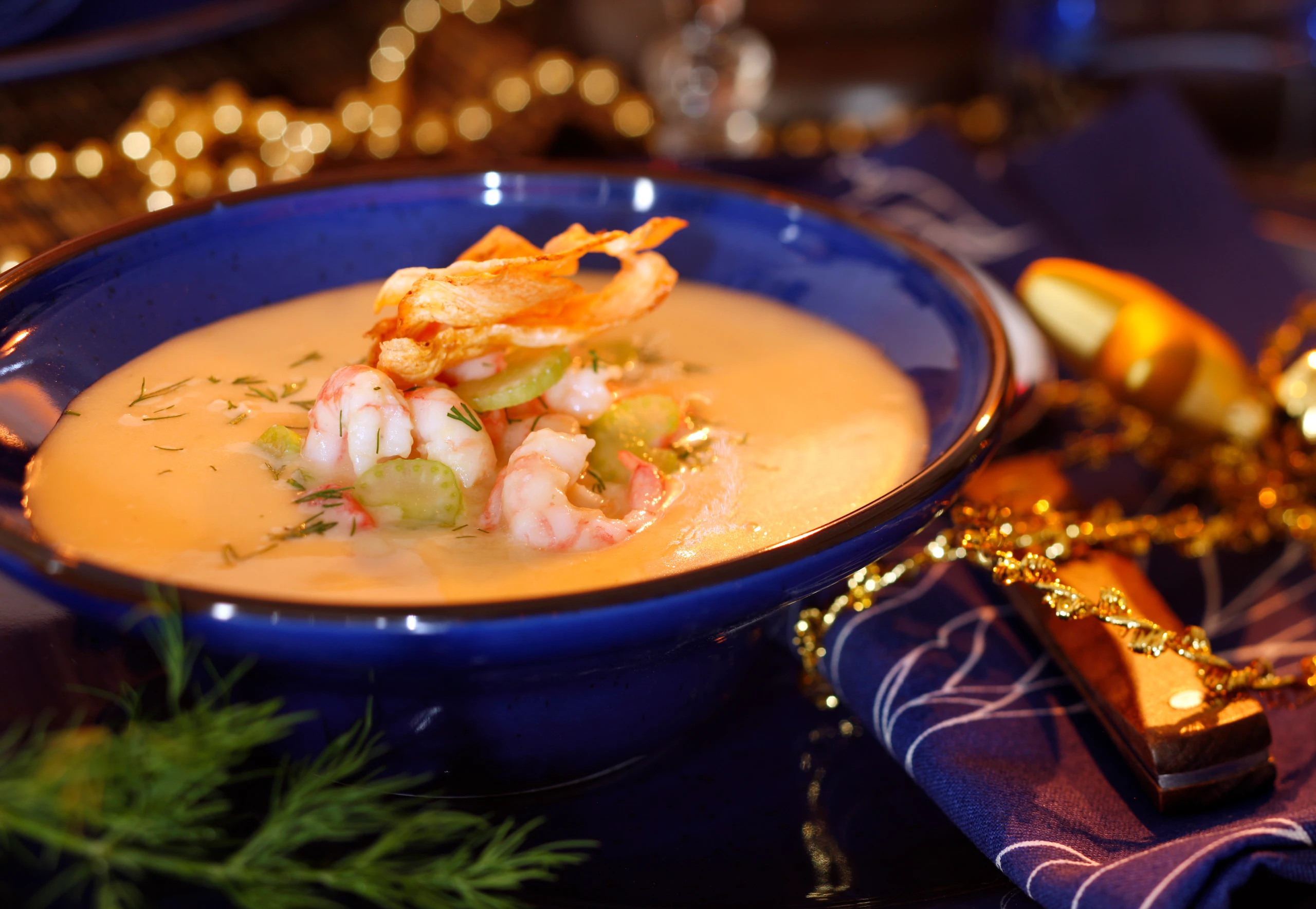 Suppe abschmecken, mit der Garnelenmischung anrichten, mit Dille bestreuen und mit Selleriescheiben garnieren.