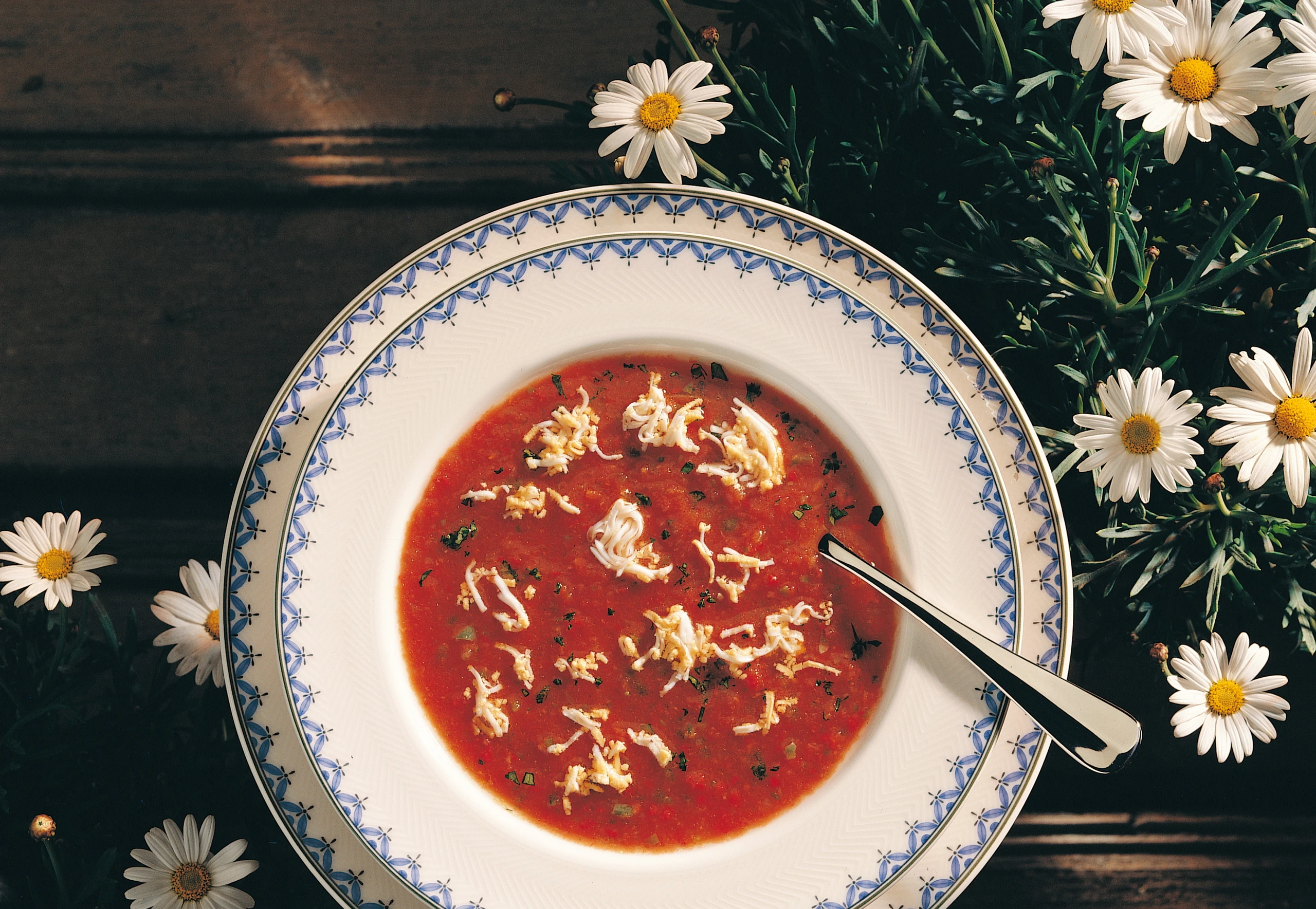 Toastbrot entrinden. Paradeiser, Paprika, Gurke und Toastbrot kleinwürfelig schneiden und durch die Faschiermaschine (mittelfeine Scheibe) drehen – siehe auch Tip. Zwiebel und Knoblauch schälen und fein hacken.