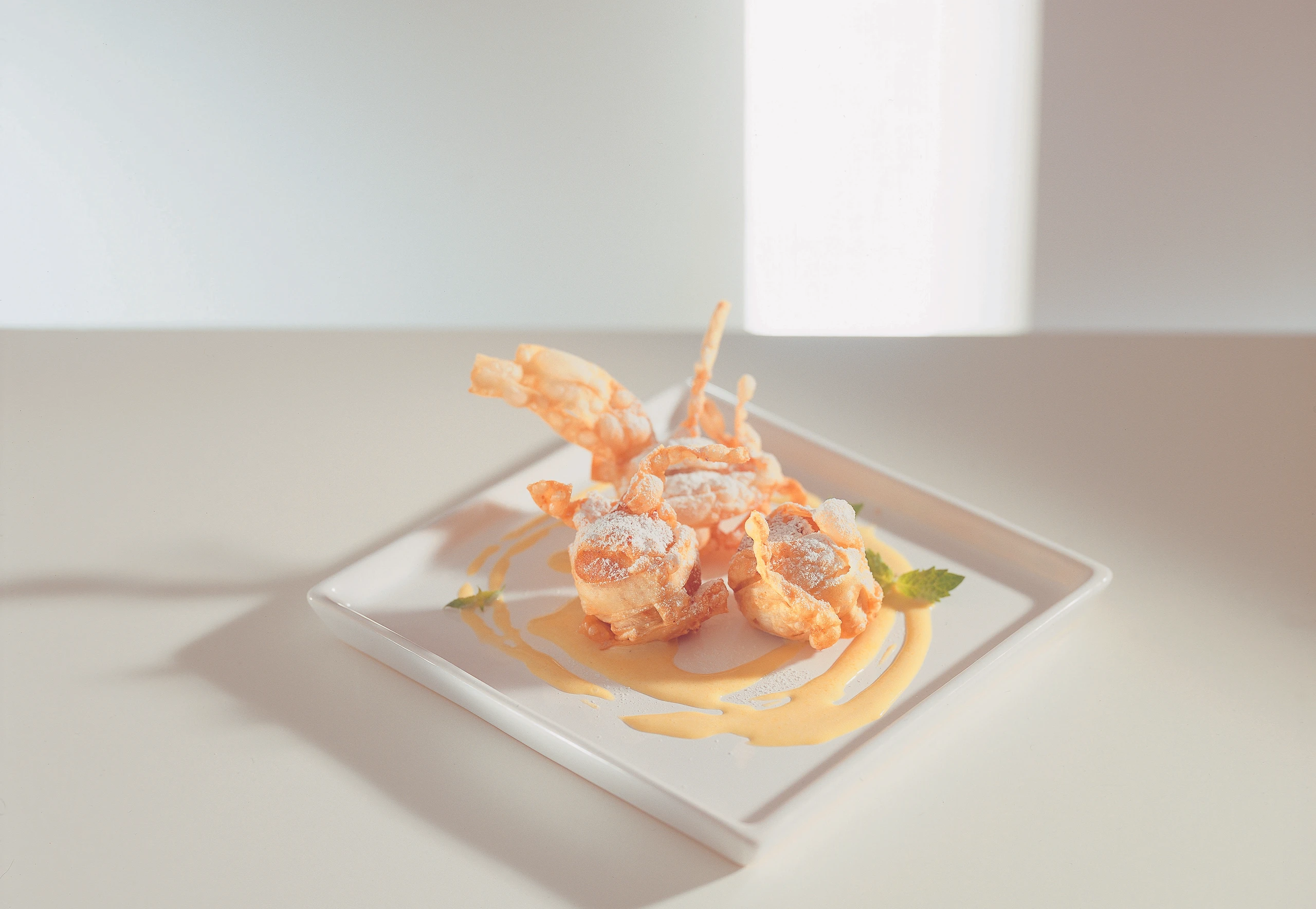Öl auf ca. 170 °C erhitzen. Apfelknödel darin goldgelb backen (dauert ca. 2 Minuten), mit einem Siebschöpfer herausheben und auf Küchenpapier gut abtropfen lassen. Knödel mit der Mandelsauce anrichten, mit Minzeblättern garnieren.