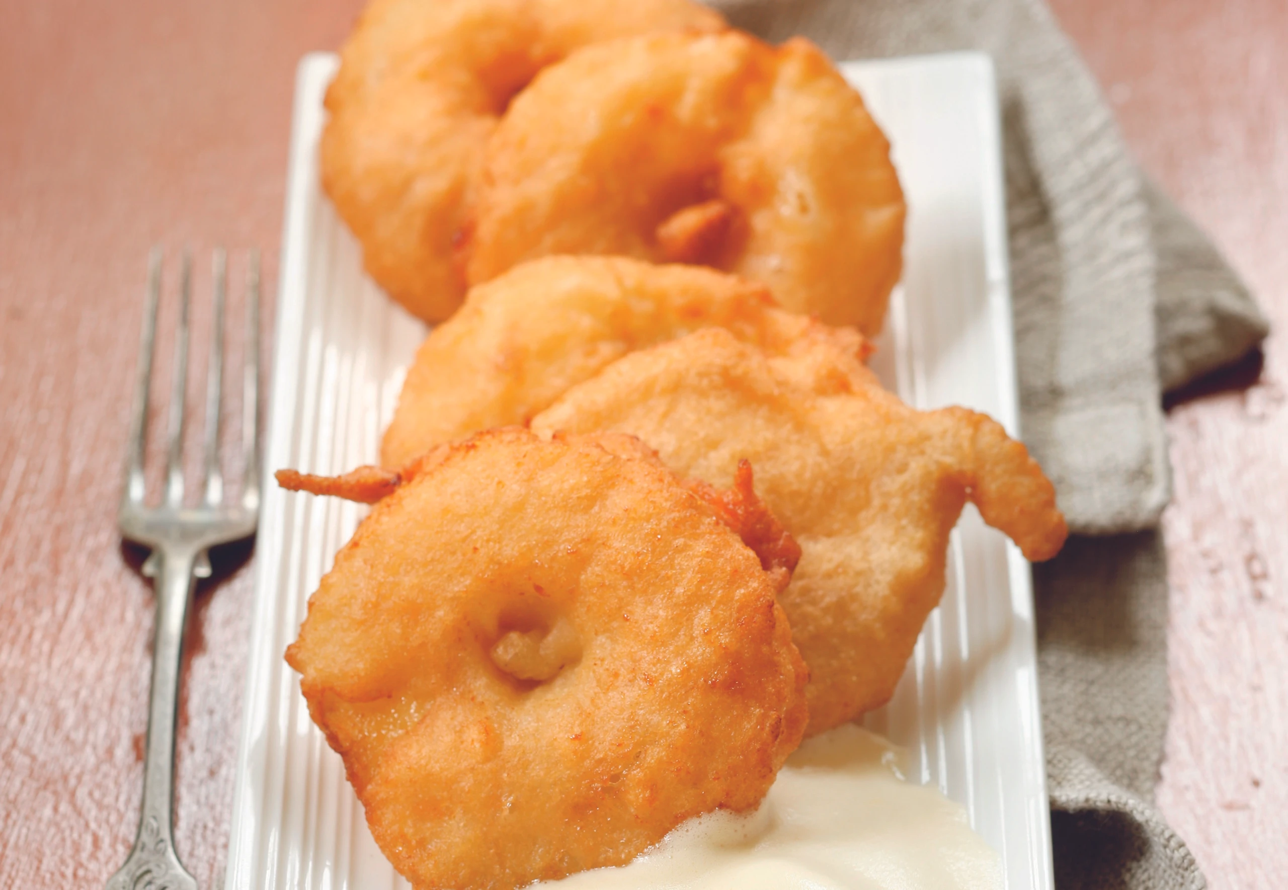 Ca. 3 Finger hoch Öl erhitzen. Apfelscheiben durch den Teig ziehen und im heißen Öl goldgelb backen. Herausheben, abtropfen lassen und mit Mostschaum servieren.