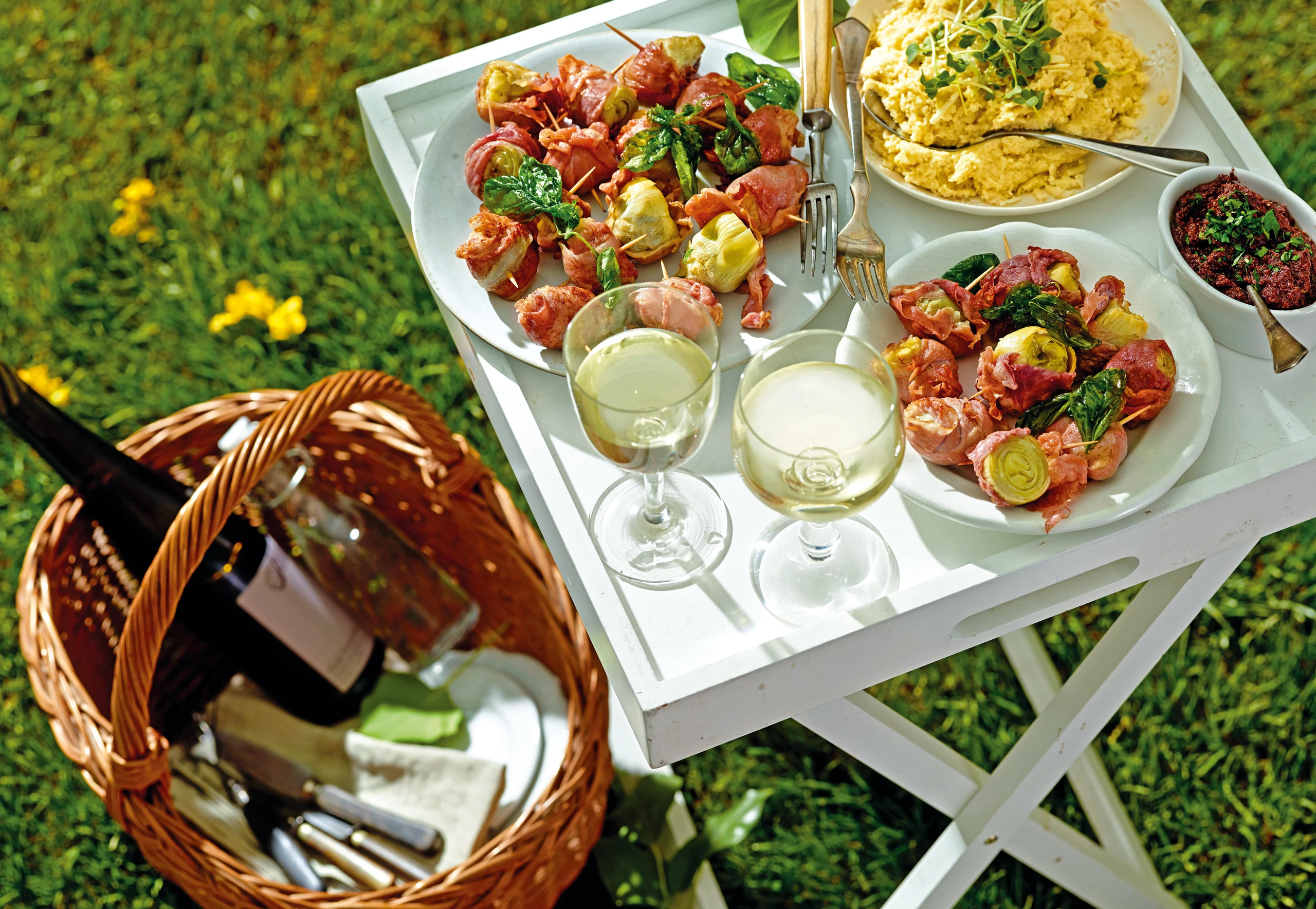 Artischockenherzen in einem Sieb abtropfen lassen und auf Küchenpapier trockentupfen. Herzen mit einer Prosciuttoscheibe eng umwickeln und mit Zahnstochern fixieren.
