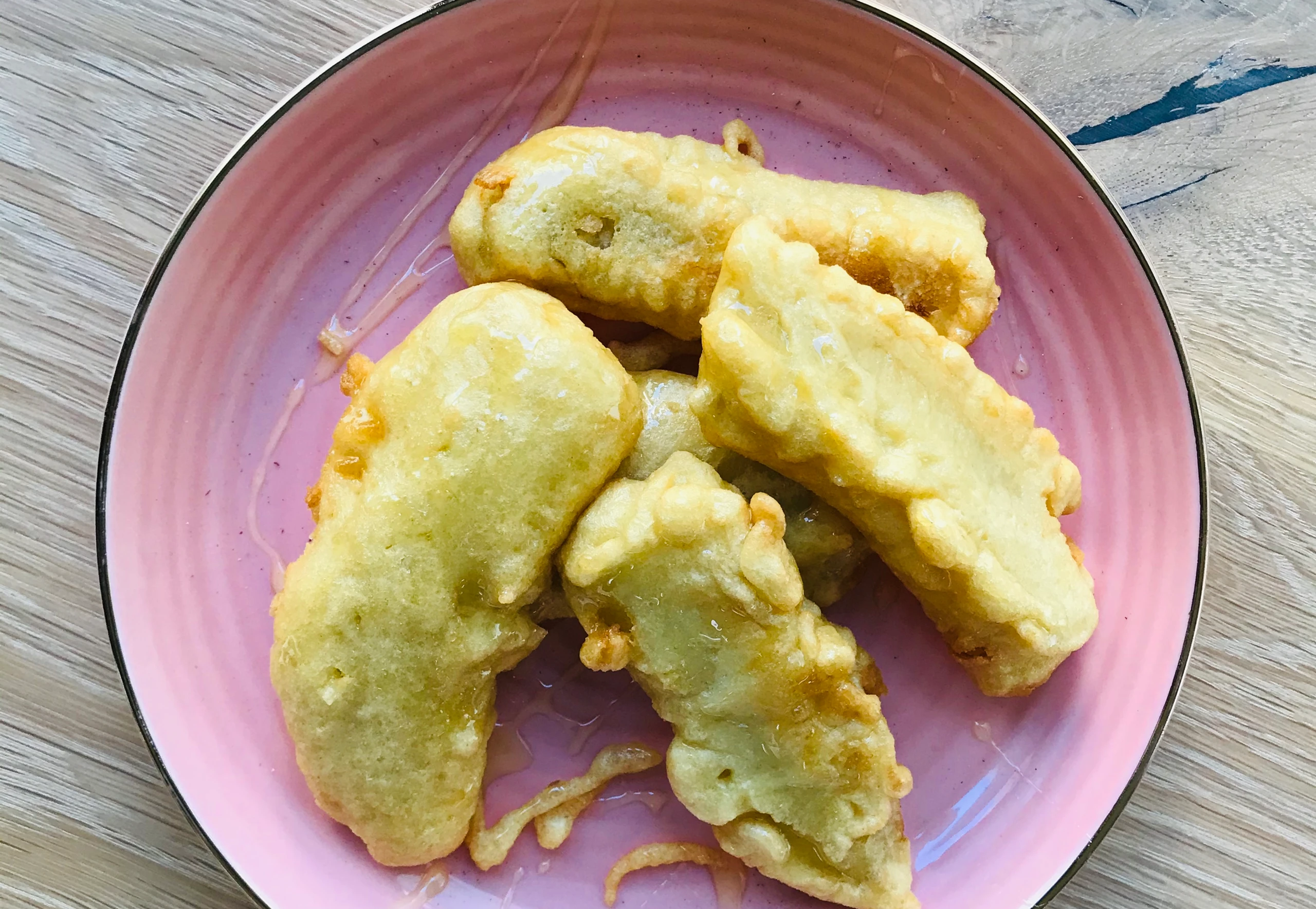 Bananen schälen und vierteln. Öl erhitzen. Bananenstücke in den Teig tauchen, im heißen Öl knusprig backen. Auf Küchenpapier kurz abtropfen lassen und mit Honig servieren.