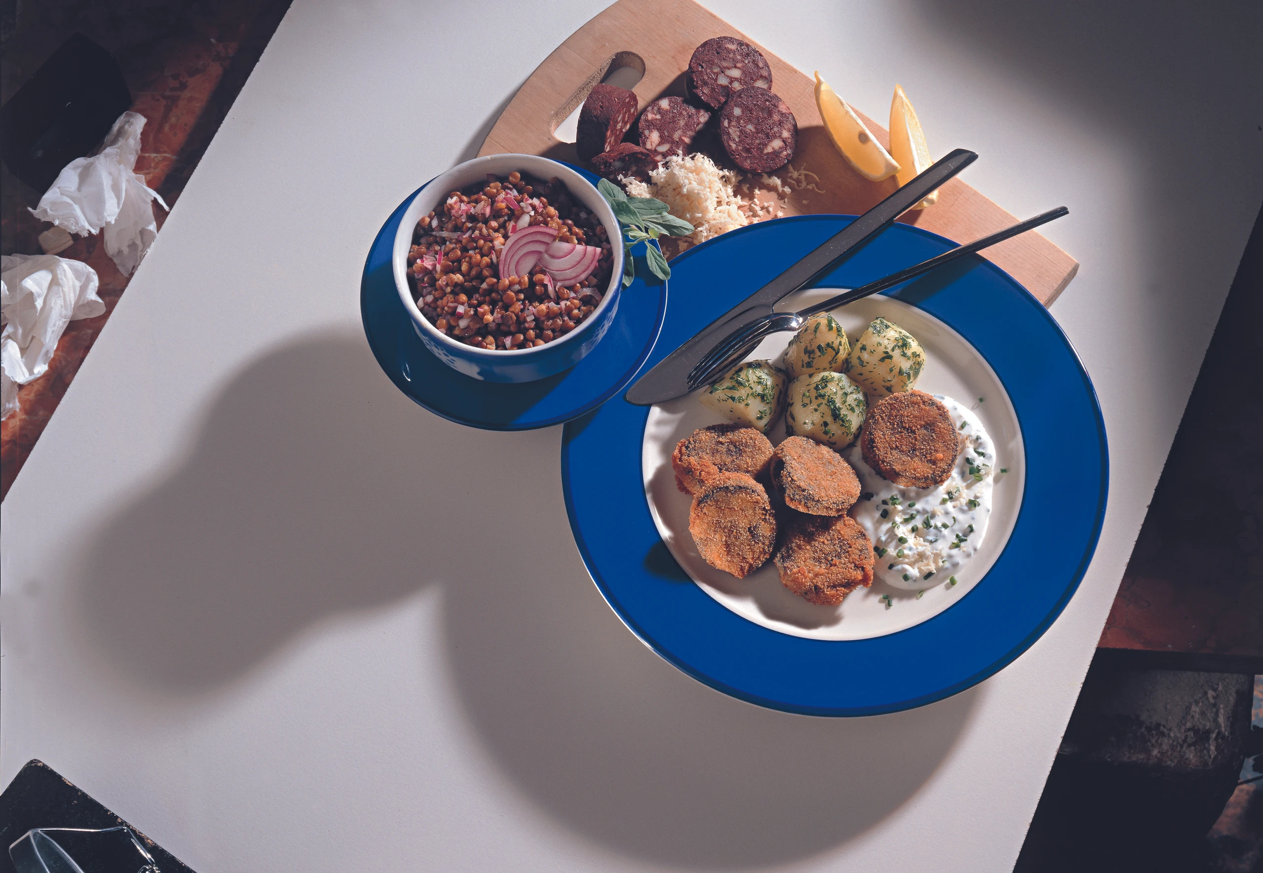 Blutwurst enthäuten und in ca. 1 1/2 cm dicke Scheiben schneiden. Scheiben in Mehl, Ei und Bröseln panieren.