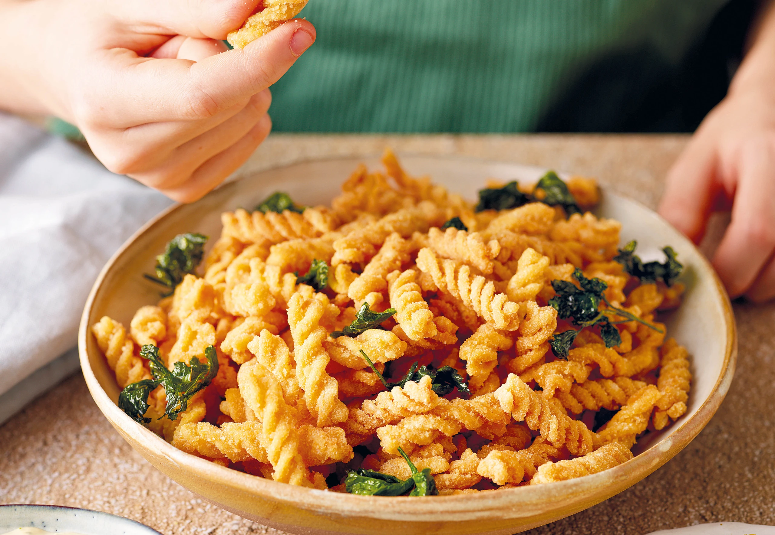 Dralli nach Packungsanleitung in reichlich Salzwasser bissfest kochen. Mit Zitronensaft und Knoblauch vermischen, salzen und pfeffern. Dralli in Mehl wenden, durch die Eier ziehen und in den Bröseln panieren. 5 Finger hoch Öl erhitzen, Dralli darin in mehreren Arbeitsgängen goldbraun backen. Mit einem Gitterlöffel herausheben und auf Küchenpapier abtropfen lassen.