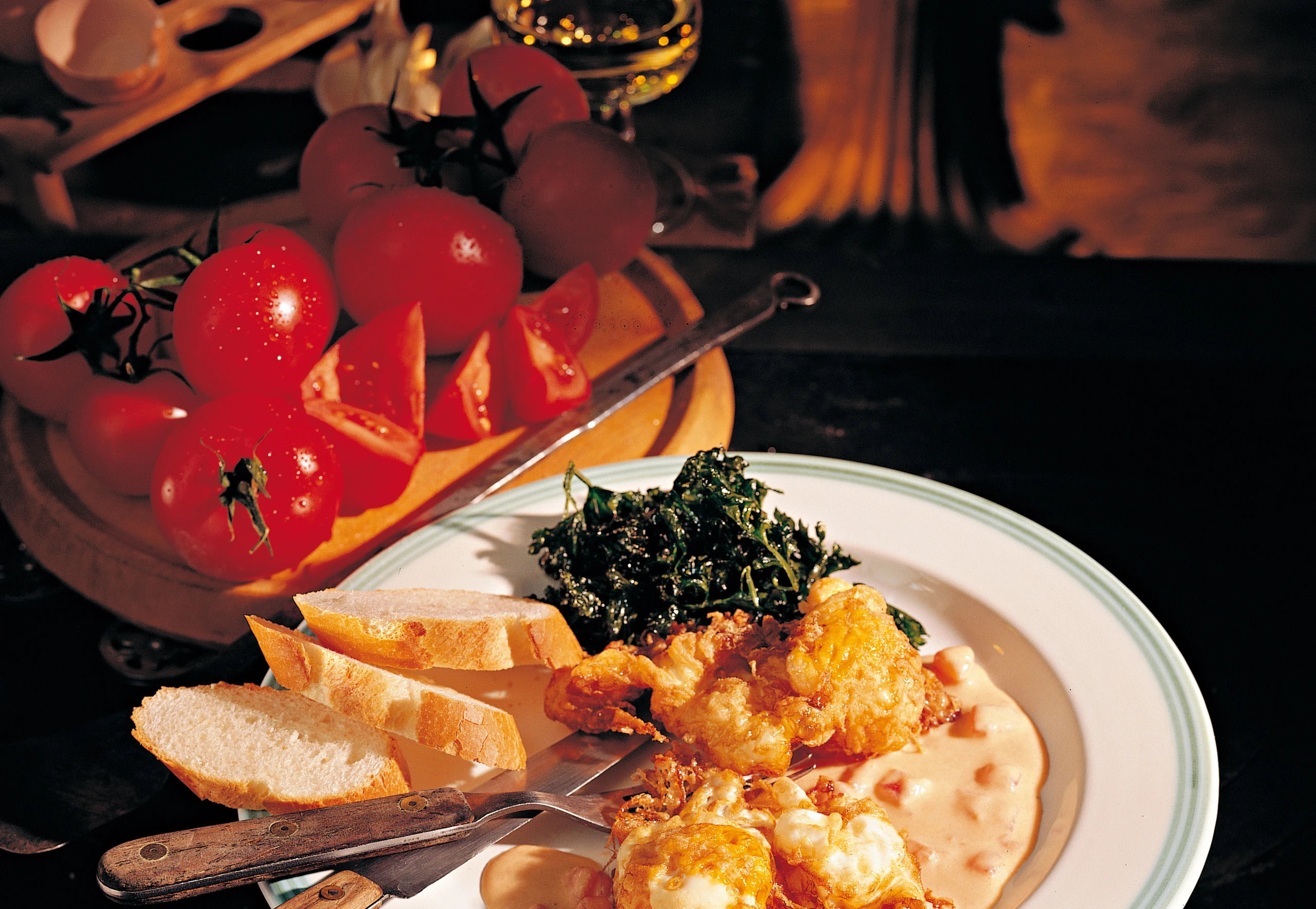 Eier aus dem Backfett heben, gut abtropfen lassen und mit dem Ragout anrichten. Als Beilage serviert man Baguette und Gemüse.