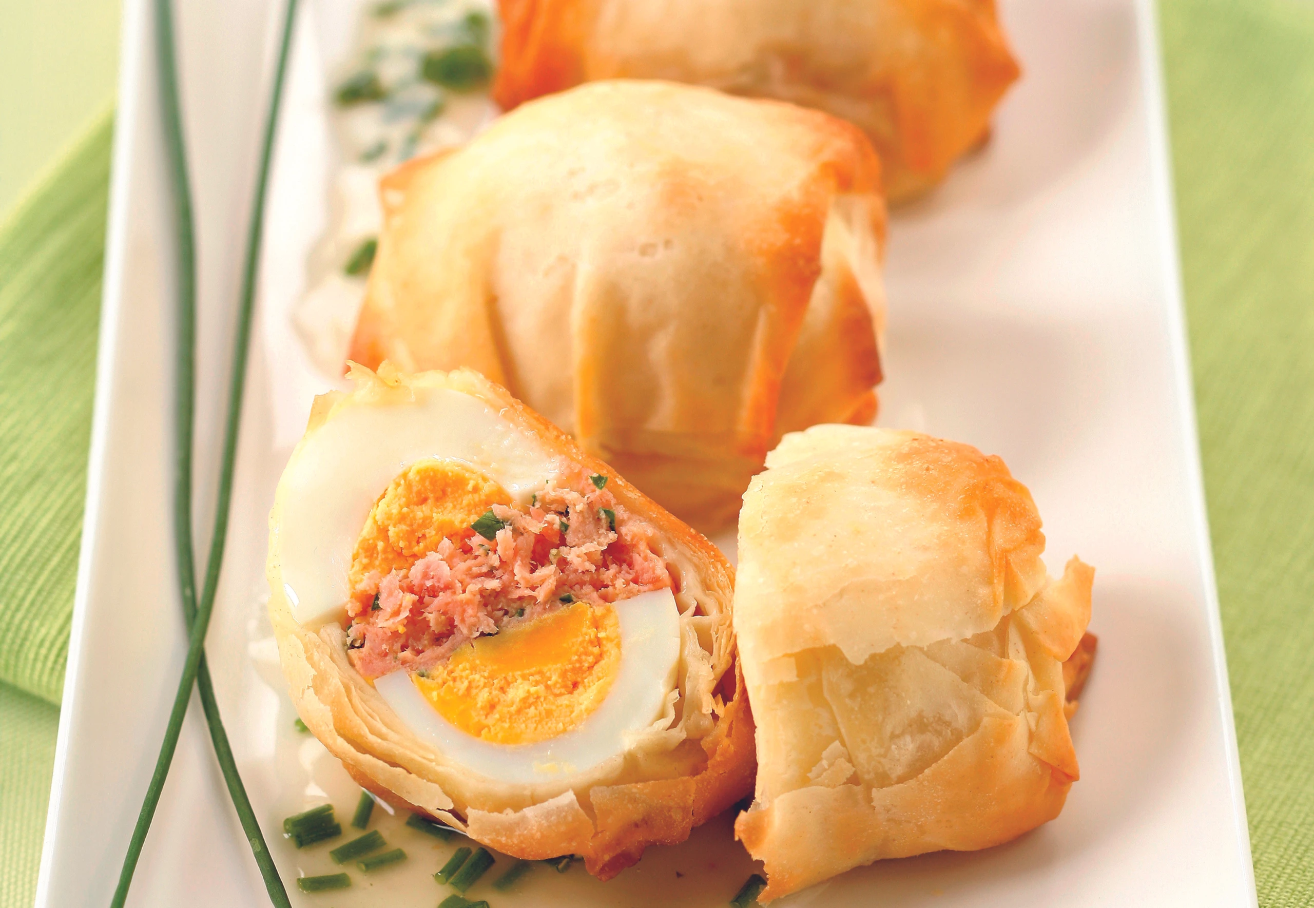 Strudelblatt auf ein feuchtes Tuch legen und mit Butter bestreichen. Zweites Strudelblatt darauflegen, mit Butter bestreichen. Teig vierteln, Eier jeweils an den unteren Teigrand setzen. Seitenränder einschlagen. Eier im Teig einrollen, auf das Blech setzen, mit Butter bestreichen und im Rohr (mittlere Schiene) 11 Minuten backen. Eier mit dem Schnittlauchfond servieren.