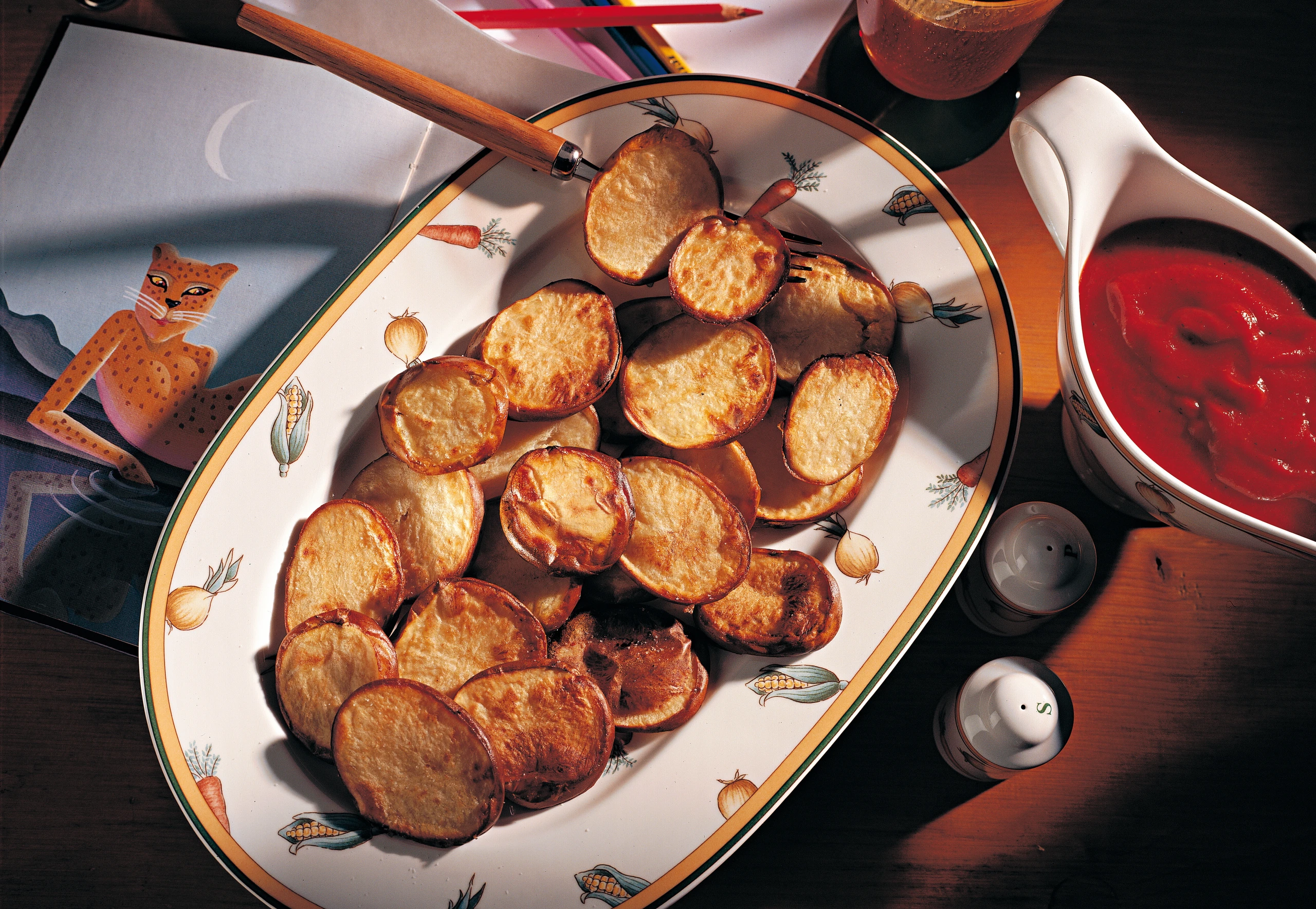 Erdäpfelscheiben aus dem Rohr nehmen, salzen und rasch servieren. Als Beilagen passen Knoblauch- und Kräutersauce, Mayonnaise oder einfach Ketchup.
