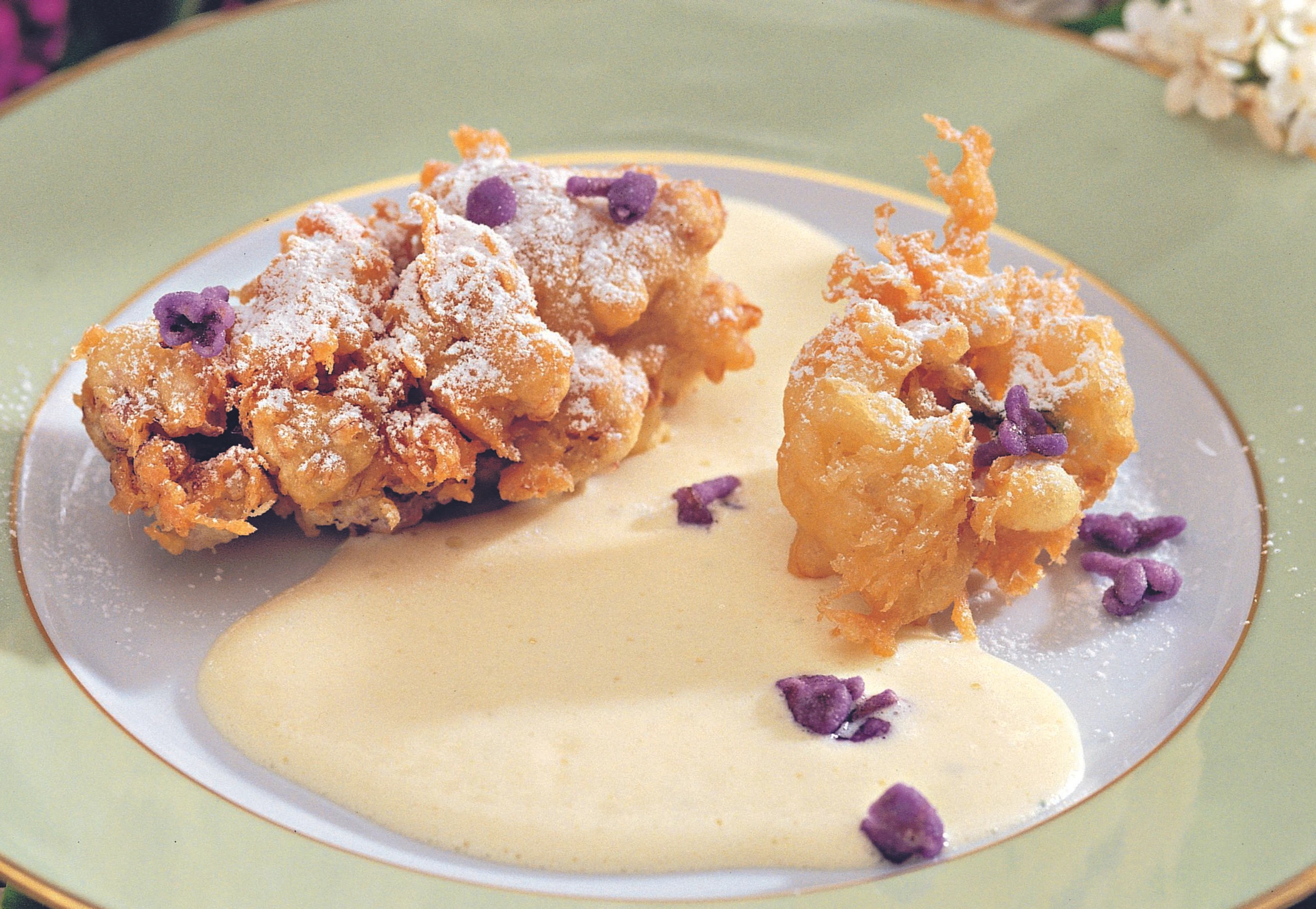 Ca. dreifingerhoch Öl erhitzen. Flieder durch den Teig ziehen, kurz abtropfen lassen, im heißen Öl schwimmend goldgelb backen, mit einem Siebschöpfer herausheben und auf Küchenpapier gut abtropfen lassen. Die gebackenen Fliederblüten mit Fliederzucker bestreuen und mit Weinsabayon (siehe Rezepte) rasch servieren.