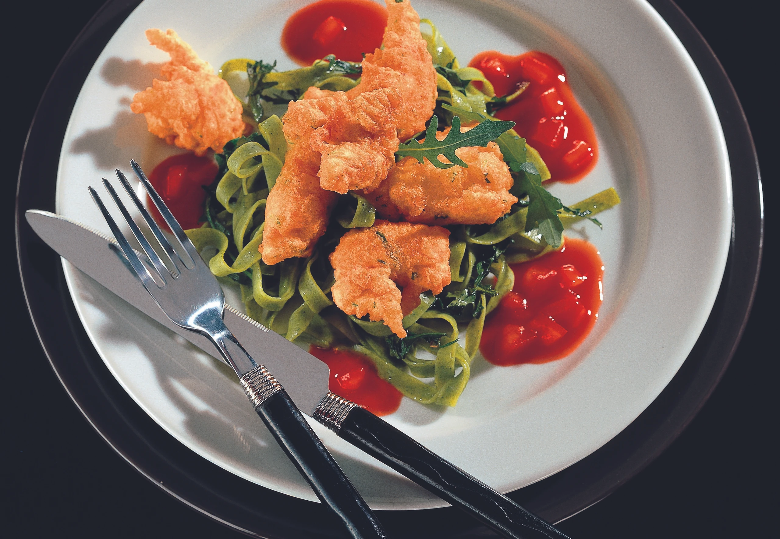 Gebackene Hühnerbruststreifen mit grünen Nudeln