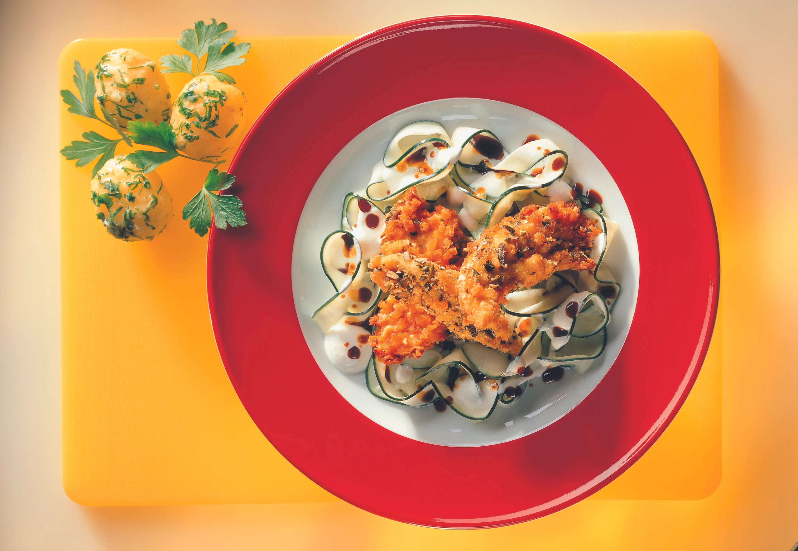 Die Hühnerbruststreifen mit den Joghurtgurken und Petersilerdäpfeln (siehe Rezepte) anrichten.
