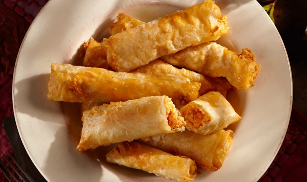 Ca. 2 Finger hoch Öl erhitzen, Röllchen darin schwimmend goldgelb backen. Röllchen herausnehmen, auf Küchenpapier abtropfen lassen und mit Oliven servieren.