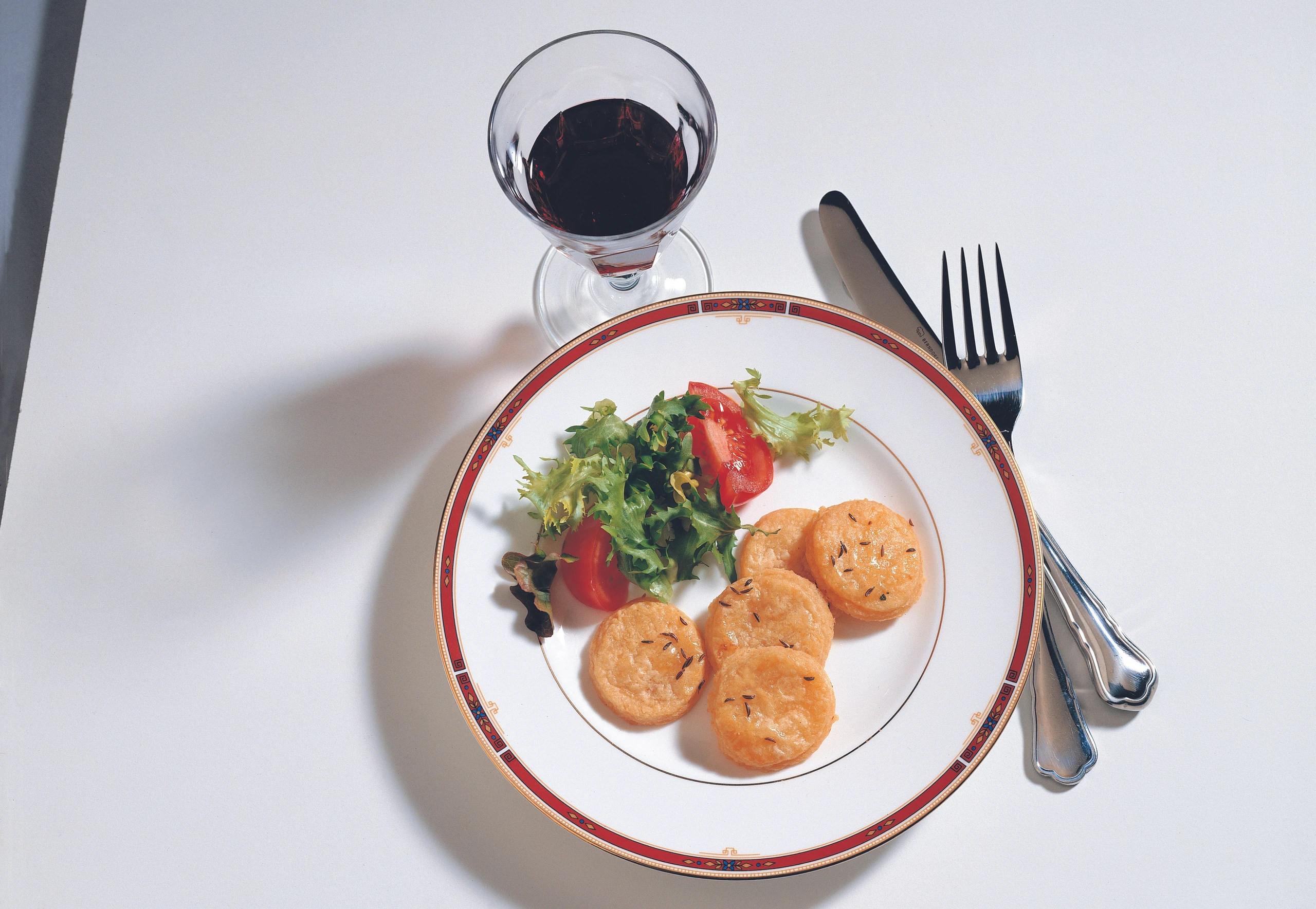 Kekse mit Kümmel bestreuen und im vorgeheizten Rohr (mittlere Schiene) ca. 1/4 Stunde backen. Gebäck aus dem Rohr nehmen, abkühlen lassen und mit Blattsalaten garniert servieren.