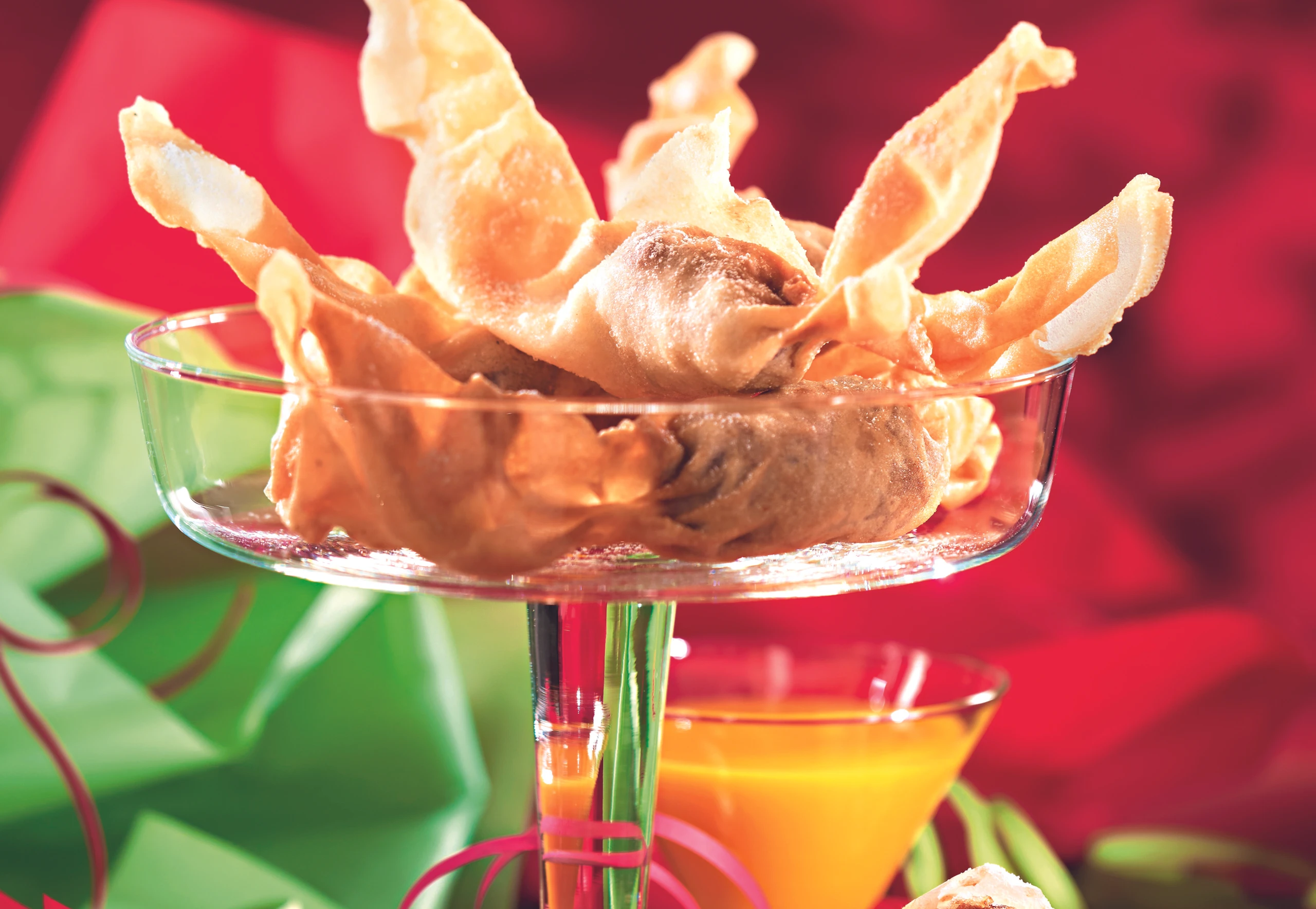 Teigblätter flach auflegen, Ränder mit Eiklar bestreichen. In die Mitte jedes Teigstückes ein wenig Fülle setzen. Teigstücke über die Fülle zu Dreiecken einschlagen, Ränder zusammendrücken. Zu Röllchen formen.