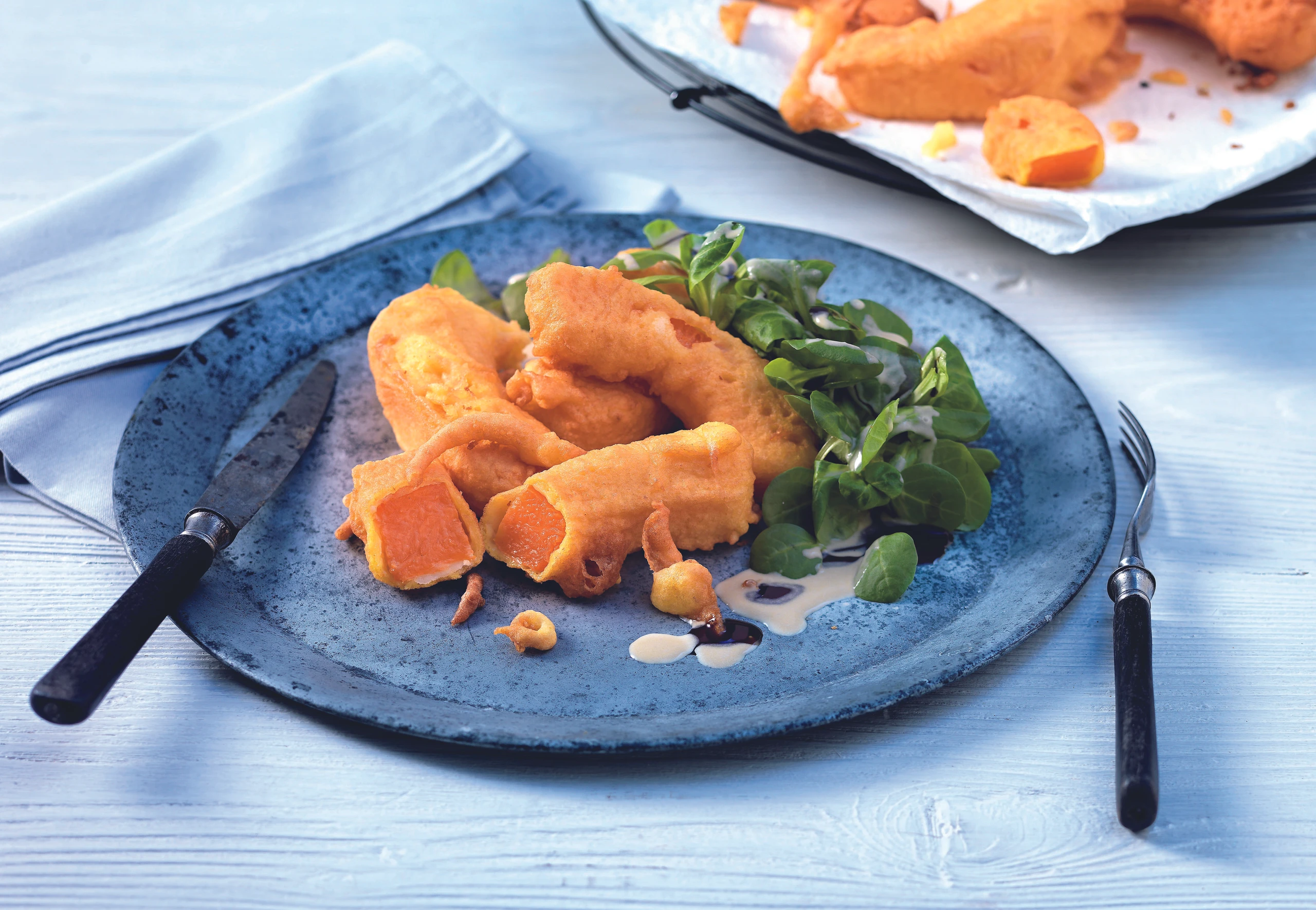 - Für den Teig Eier trennen. Mehl, Curry, Dotter, Milch und Öl glatt rühren. Eiklar mit 1 Prise Salz zu Schnee schlagen und unterheben. Öl erhitzen. Kürbis mit Mehl stauben, in den Teig tauchen, im Öl backen. Herausnehmen und abtropfen lassen.