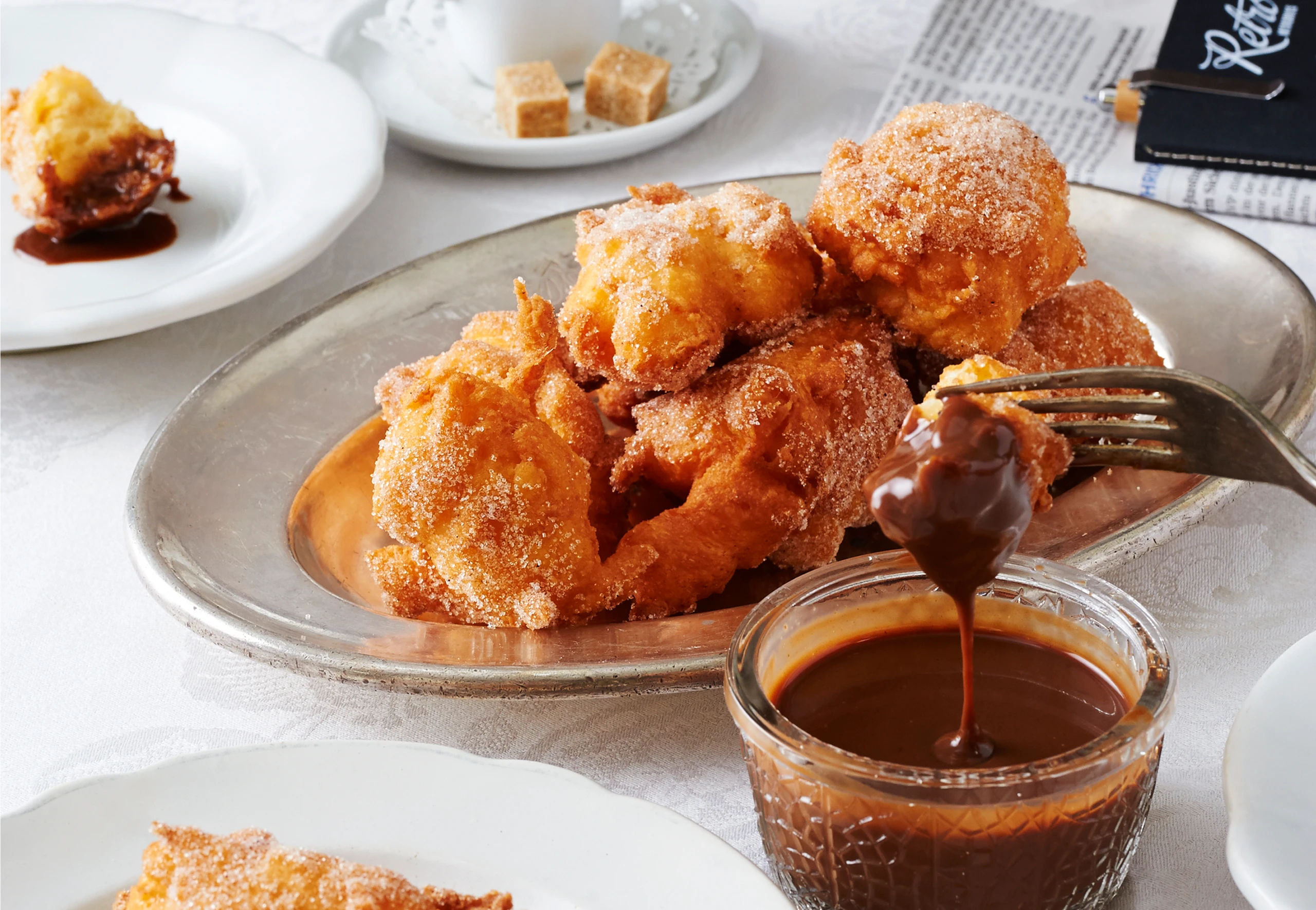 Ca. 3 Finger hoch Öl erhitzen. Aus dem Teig mit einem Esslöffel gleich große Stücke ausstechen und in das heiße Öl legen. Mäuse schwimmend goldbraun backen (ca. 2 Minuten), nach halber Garzeit wenden. Mäuse mit einem Gitterlöffel aus dem Öl heben, gut abtropfen lassen und im Zimtzucker wälzen. Mäuse mit der Nougatsauce anrichten.