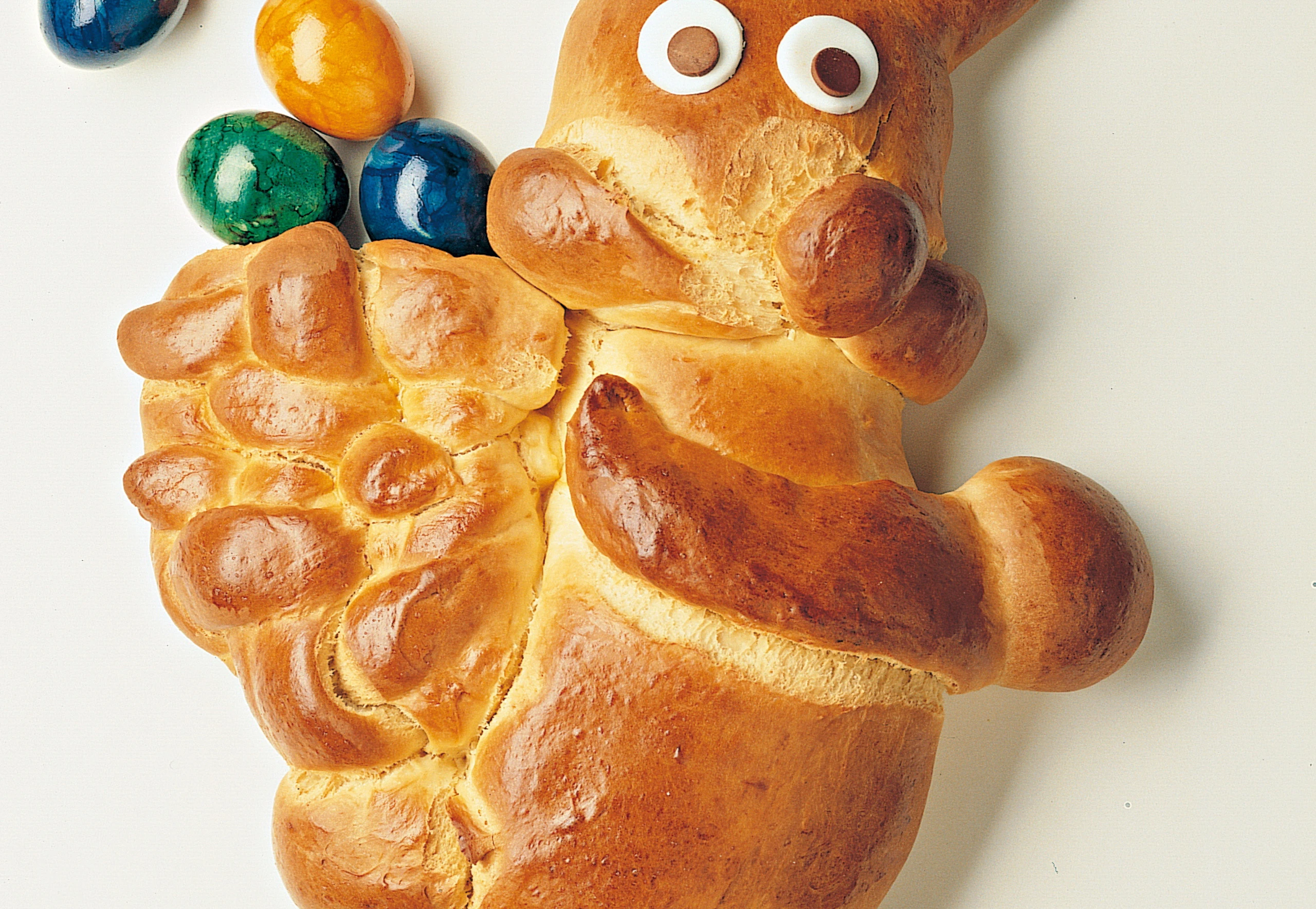 Hasen auf ein mit Backpapier belegtes Blech setzen und ca. 10 Minuten rasten lassen. Ungefärbte, rohe Eier als Platzhalter mitbacken. Nach dem Backen durch gefärbte Eier ersetzen. Den Hasen mit verquirltem Ei bestreichen und im vorgeheizten Rohr (mittlere Schiene) ca. 3/4 Stunden goldgelb backen.