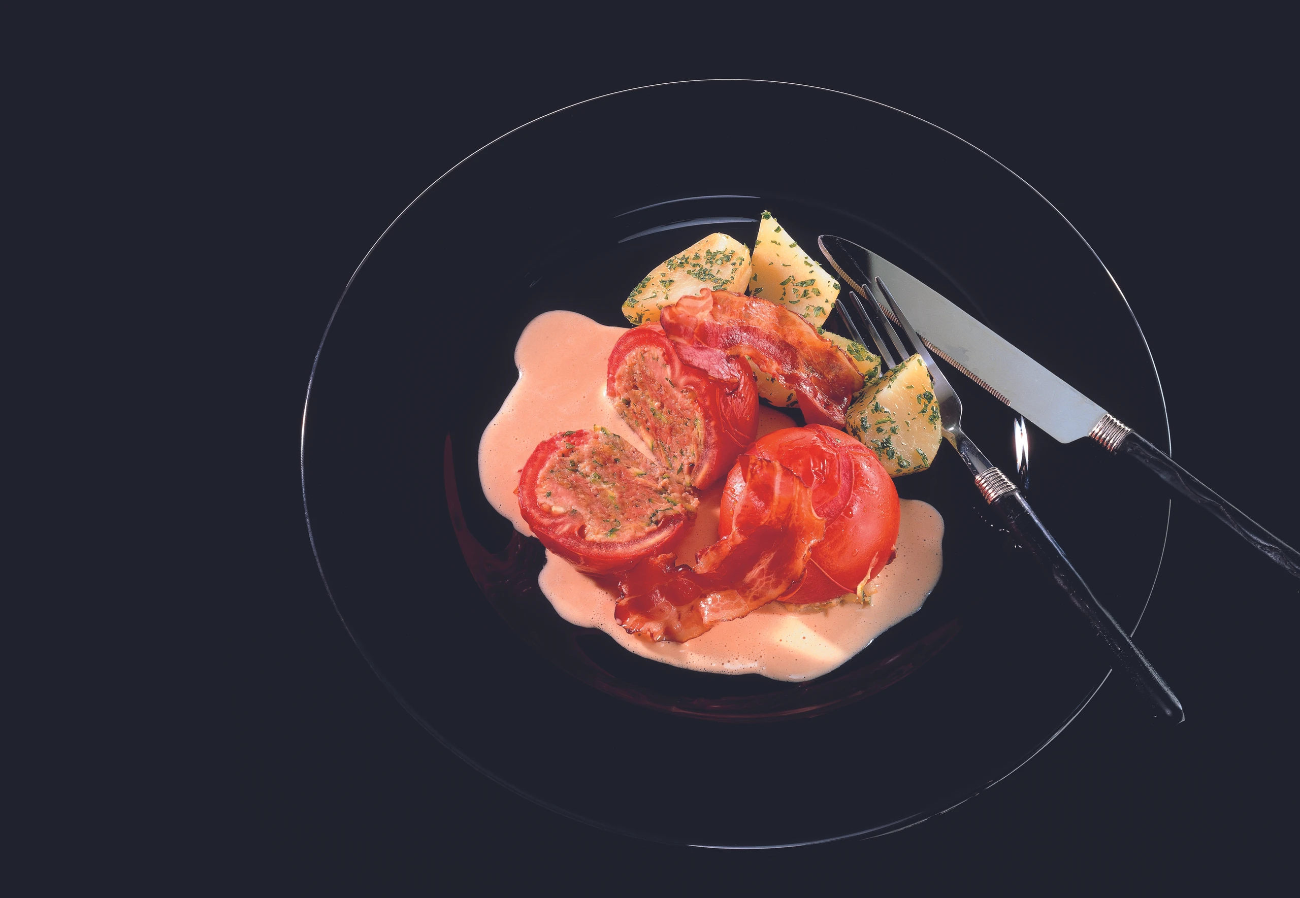 Paradeiser aus dem Rohr nehmen. Den Paradeiser- Bratfond und die Stärkemischung in die Sauce gießen. Sauce aufkochen, mit Salz, Pfeffer und zerdrücktem Knoblauch würzen. Sauce mit dem Stabmixer aufschlagen und mit den gefüllten Paradeisern anrichten.