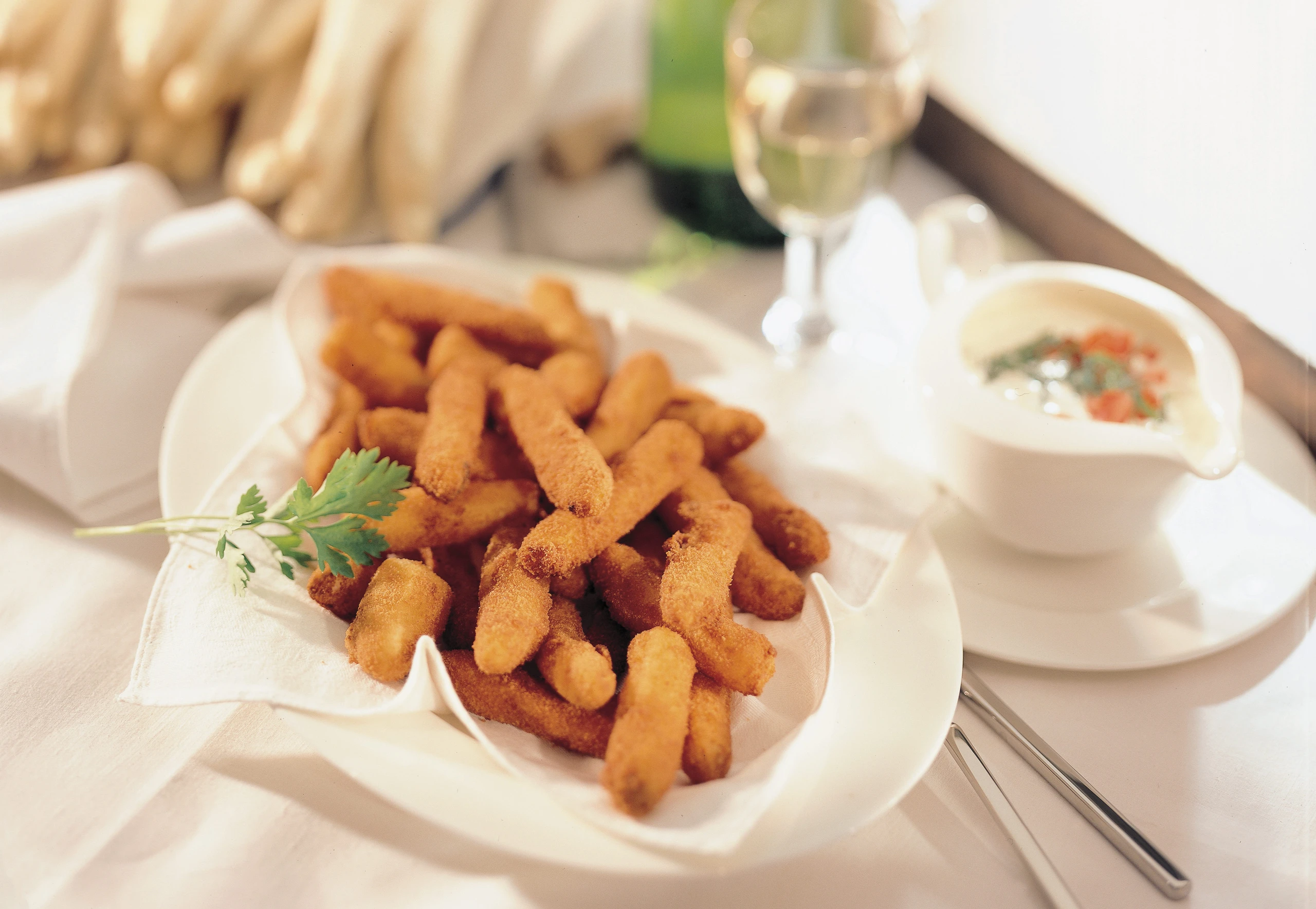 - Spargelstücke in Mehl wenden, durch die Eimischung ziehen und in den Bröseln panieren, im heißen Öl goldgelb backen (dauert 3-4 Minuten). Spargel aus dem Fett heben, auf Küchenpapier gut abtropfen lassen und mit dem Basilikumrahm servieren.