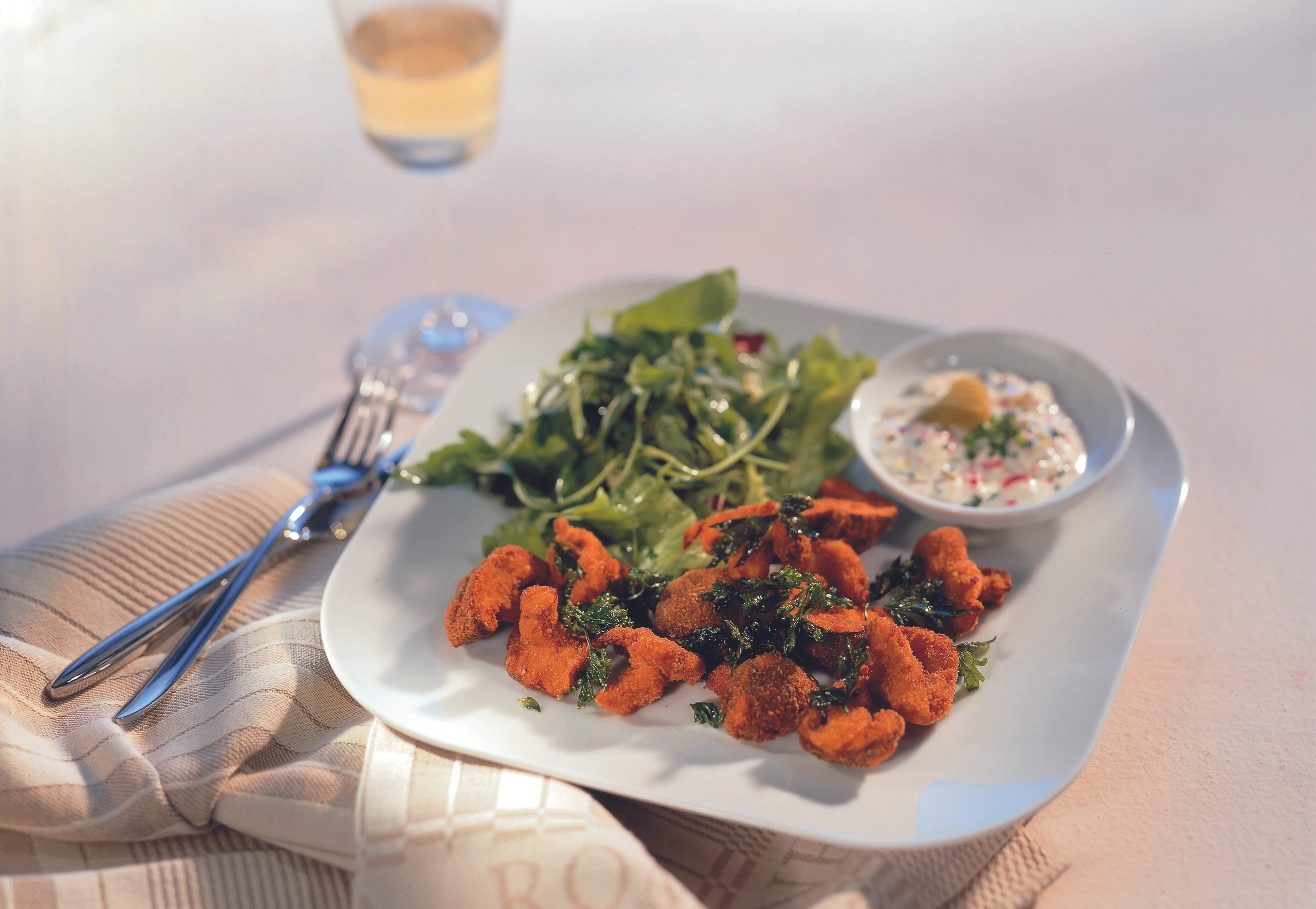 - Petersilblättchen mit Mehl stauben und kurz, ca. 10 Sekunden, im heißen Fett backen. (Vorsicht, das Öl spritzt stark beim Einlegen der Petersilblättchen!) Petersilie auf Küchenpapier abtropfen lassen, mit Salz würzen.