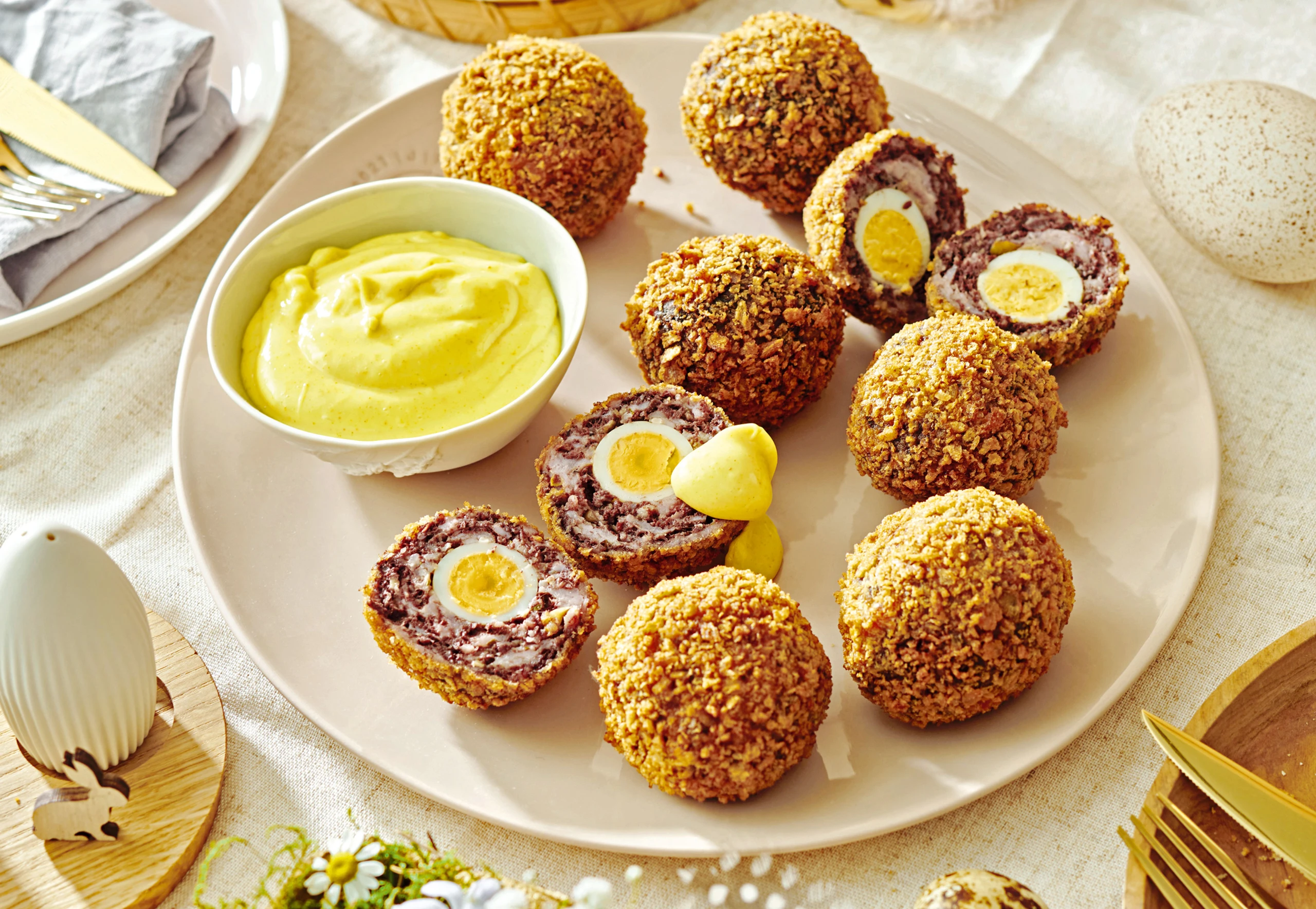 Mischung in 14 Portionen teilen und flach drücken. Je 1 Ei hineinlegen, Masse über das Ei schlagen und verschließen.