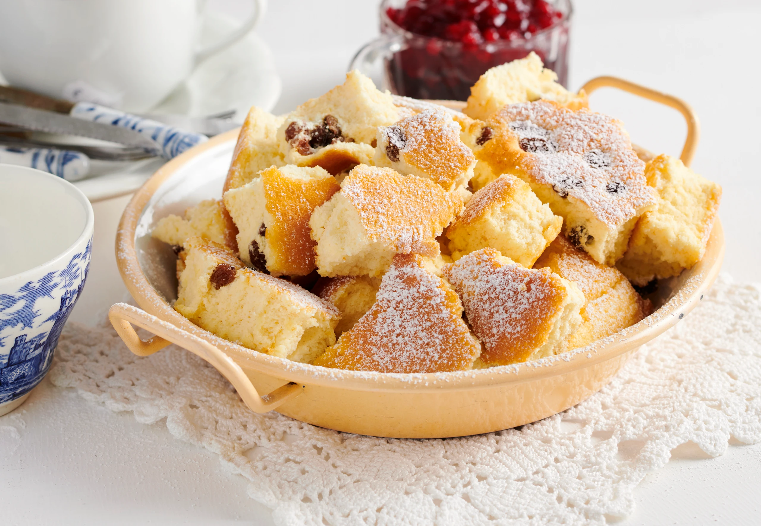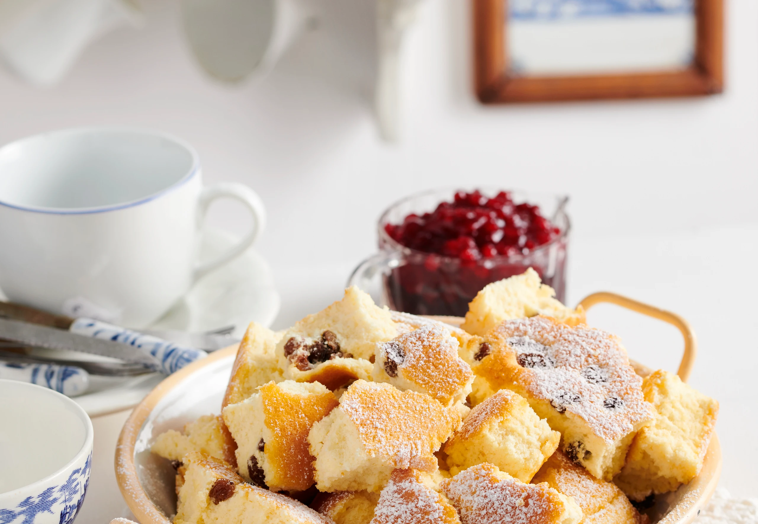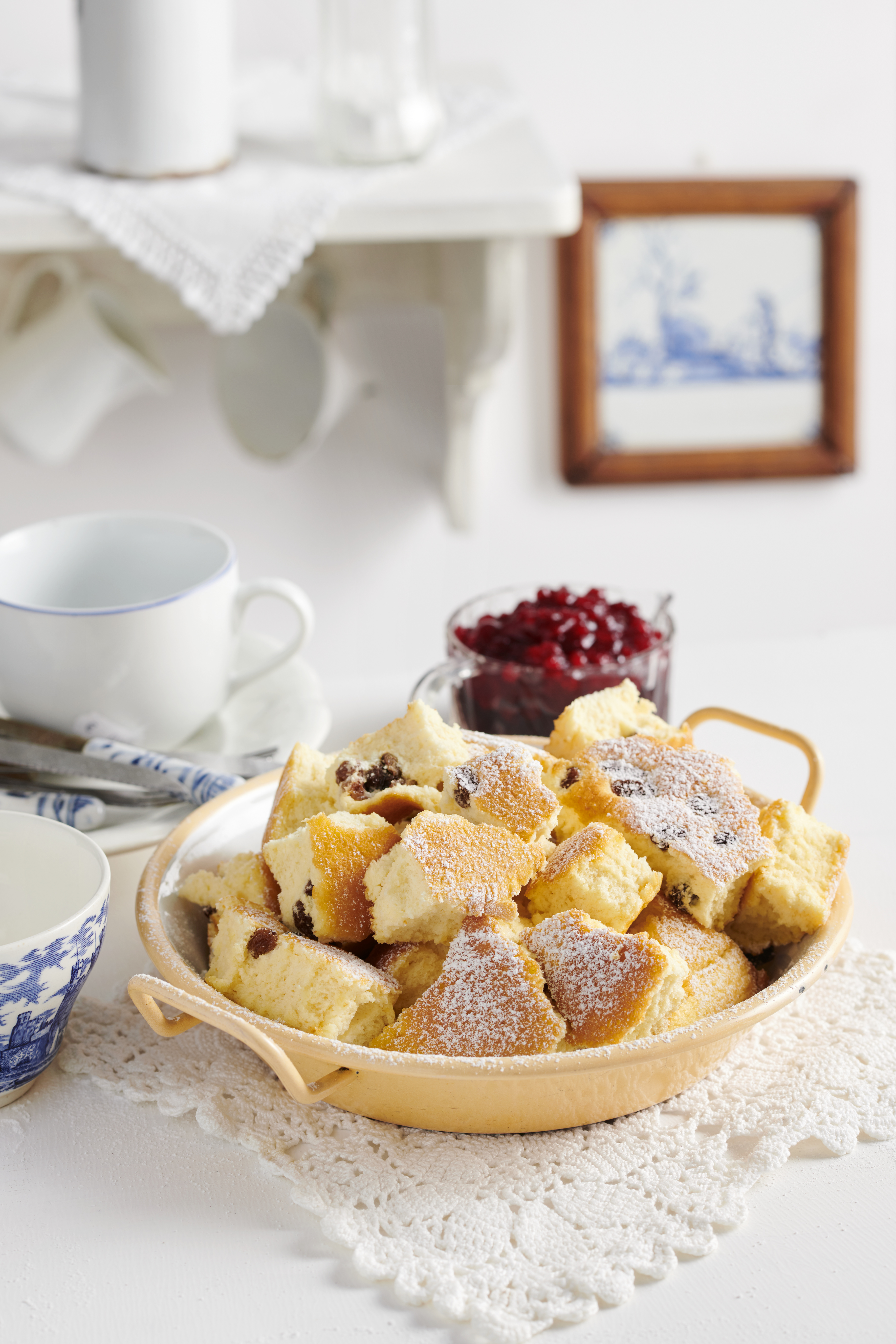 Butter in einem ofenfesten Pfandl (Ø ca. 22 cm) zerlassen. Masse einfüllen, Rosinen darüber streuen. Am Herd bei schwacher Hitze ca. 2 Minuten anbacken. Schmarrn im Rohr (mittlere Schiene / Gitterrost) ca. 15 Minuten goldbraun backen. Herausnehmen, zerteilen und mit Staubzucker bestreuen. Mit Preiselbeerkompott servieren.