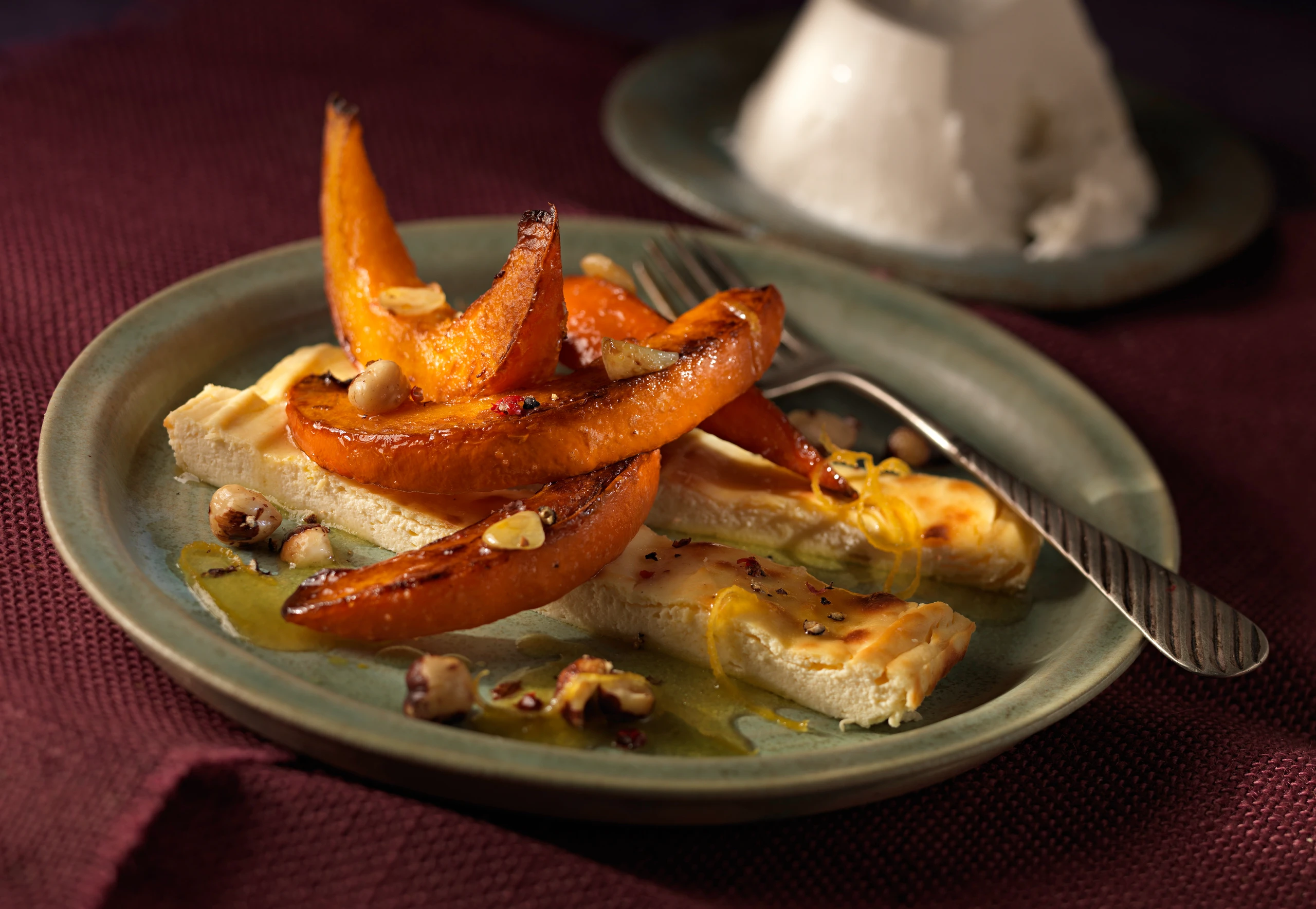 Gebackenen Ricotta in Streifen schneiden und mit den Kürbisspalten anrichten. Kürbis mit Marinade beträufeln, mit Haselnüssen und grob geschrotetem Pfeffer bestreuen.