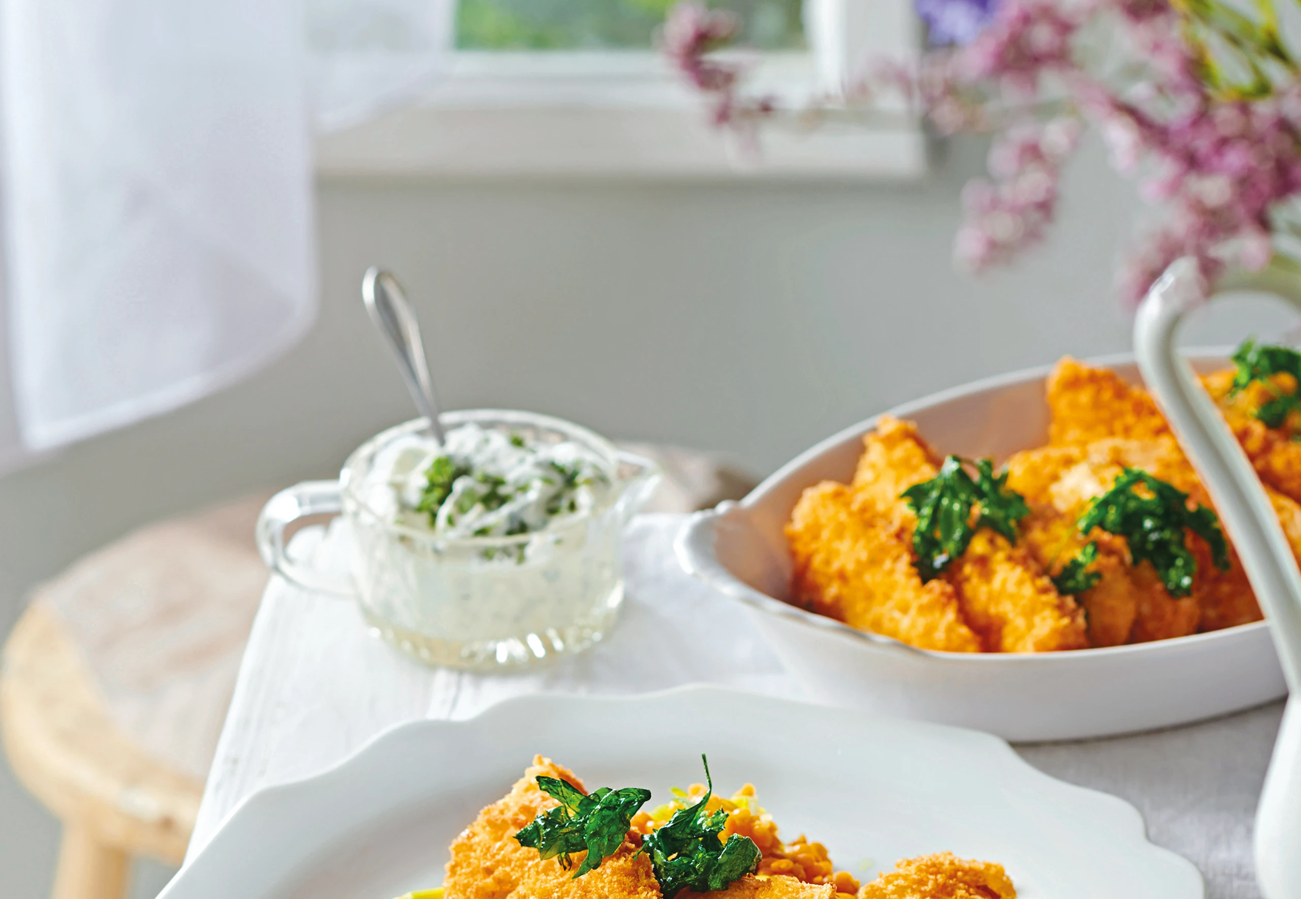 Ca. drei Finger hoch Öl erhitzen, Sellerie darin schwimmend goldgelb backen (am besten in zwei Arbeitsgängen). Sellerie aus der Pfanne nehmen und auf Küchenpapier abtropfen lassen. Petersilblättchen ins Öl geben und einige Sekunden backen. Herausheben, gut abtropfen lassen und wenig salzen. Sellerie anrichten, mit Petersilie garnieren und mit Sauce und Salat servieren.