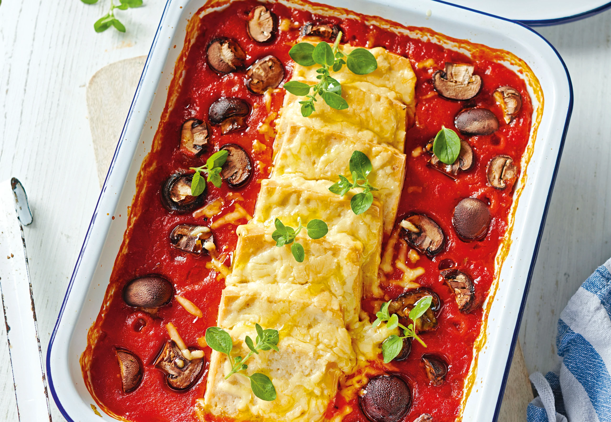 Rohr auf 180°C vorheizen. Sauce in eine Auflaufform füllen. Tofuscheiben mittig in die Sauce legen und mit Käse bestreuen. Champignons halbieren und zugeben. Im Rohr (mittlere Schiene / Gitterrost) ca. 30 Minute backen. Herausnehmen und mit etwas Olivenöl beträufeln. Dazu passt Basmatireis.