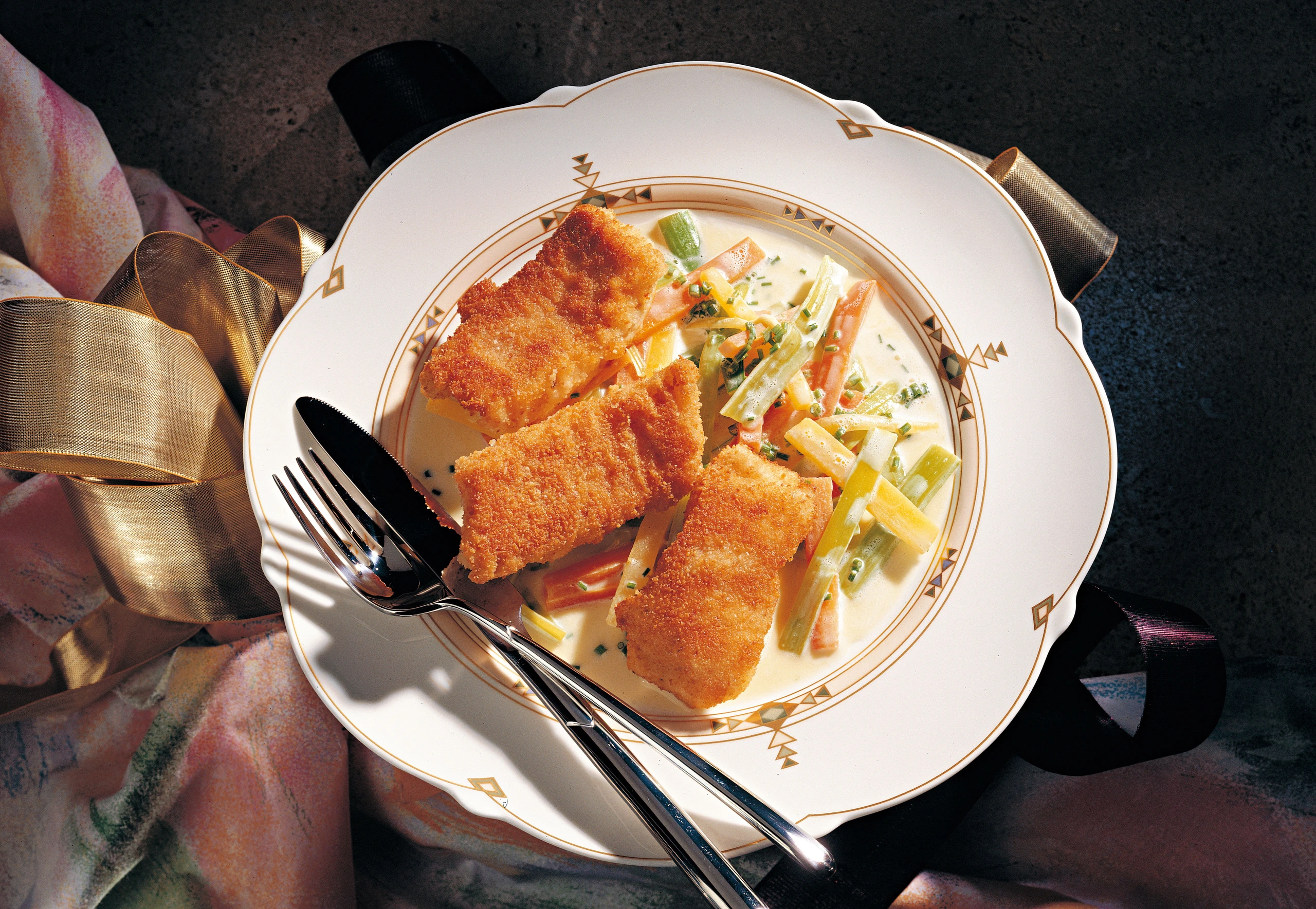 Nur eine Seite der Fischfilets zuerst in Mehl, dann in Ei und Semmelbröseln panieren. Ca. 1 fingerhoch Backfett erhitzen, die Fischstücke mit der panierten Seite nach unten einlegen und goldgelb backen. Nach ca. 1/2 Minute wenden und fertigbacken.