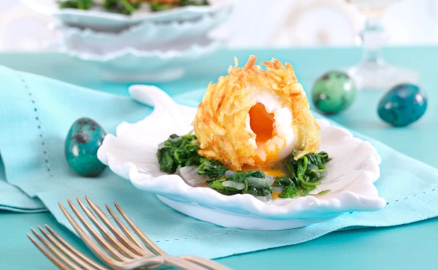 In einem Topf ca. 5 cm hoch Öl erhitzen, Eier darin schwimmend goldgelb backen. Mit einem Gitterlöffel herausheben und auf Küchenpapier abtropfen lassen. Gebackene Eier auf dem Spinat anrichten.