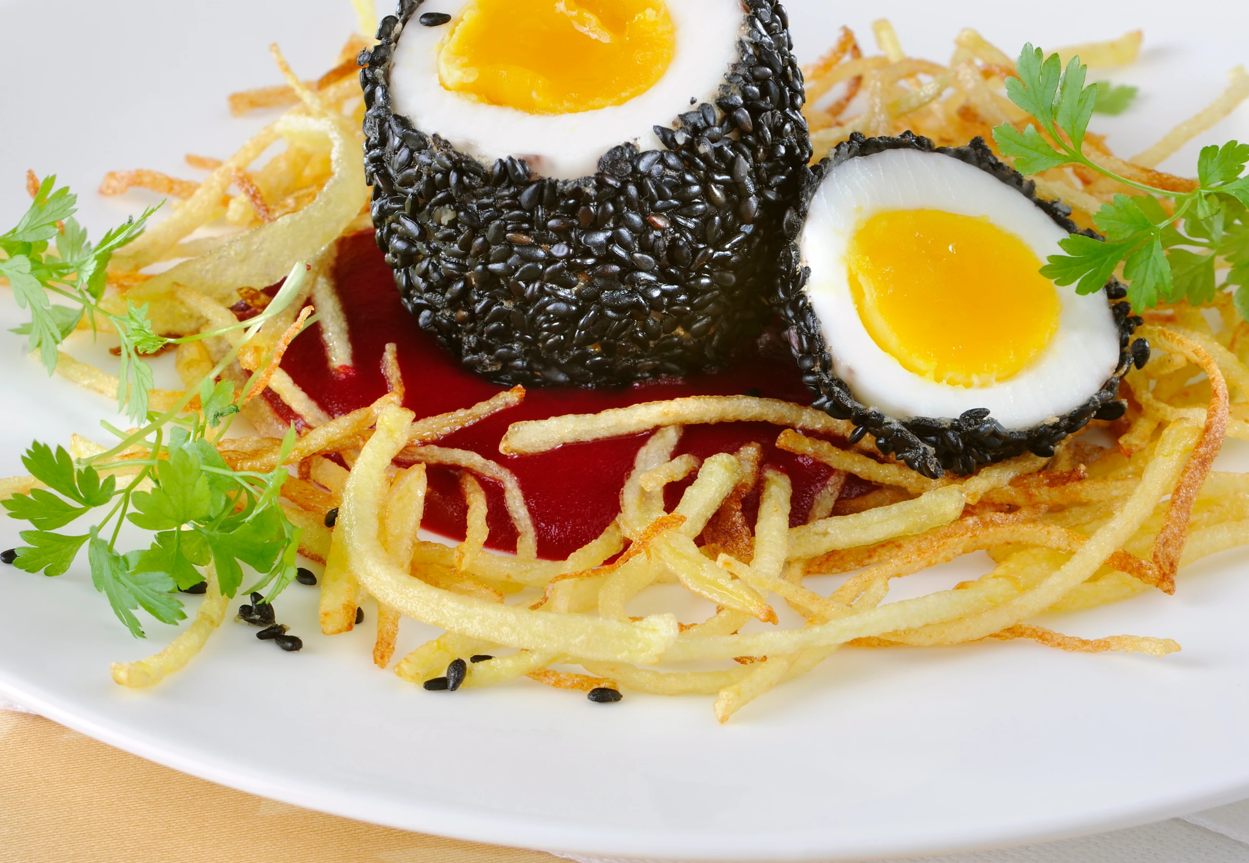 - Eier in Mehl, Ei und Sesam panieren, im Öl 1 Minute backen, auf Küchenpapier abtropfen lassen. Mit Püree und Erdäpfelstroh anrichten, mit Kerbel garnieren.
