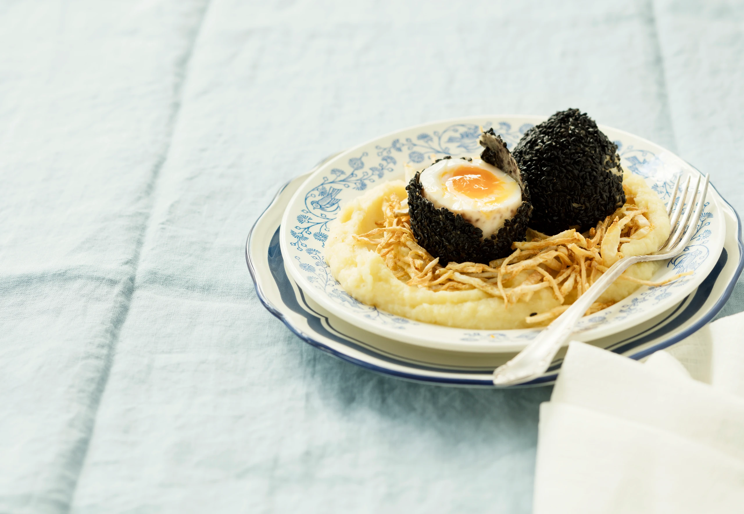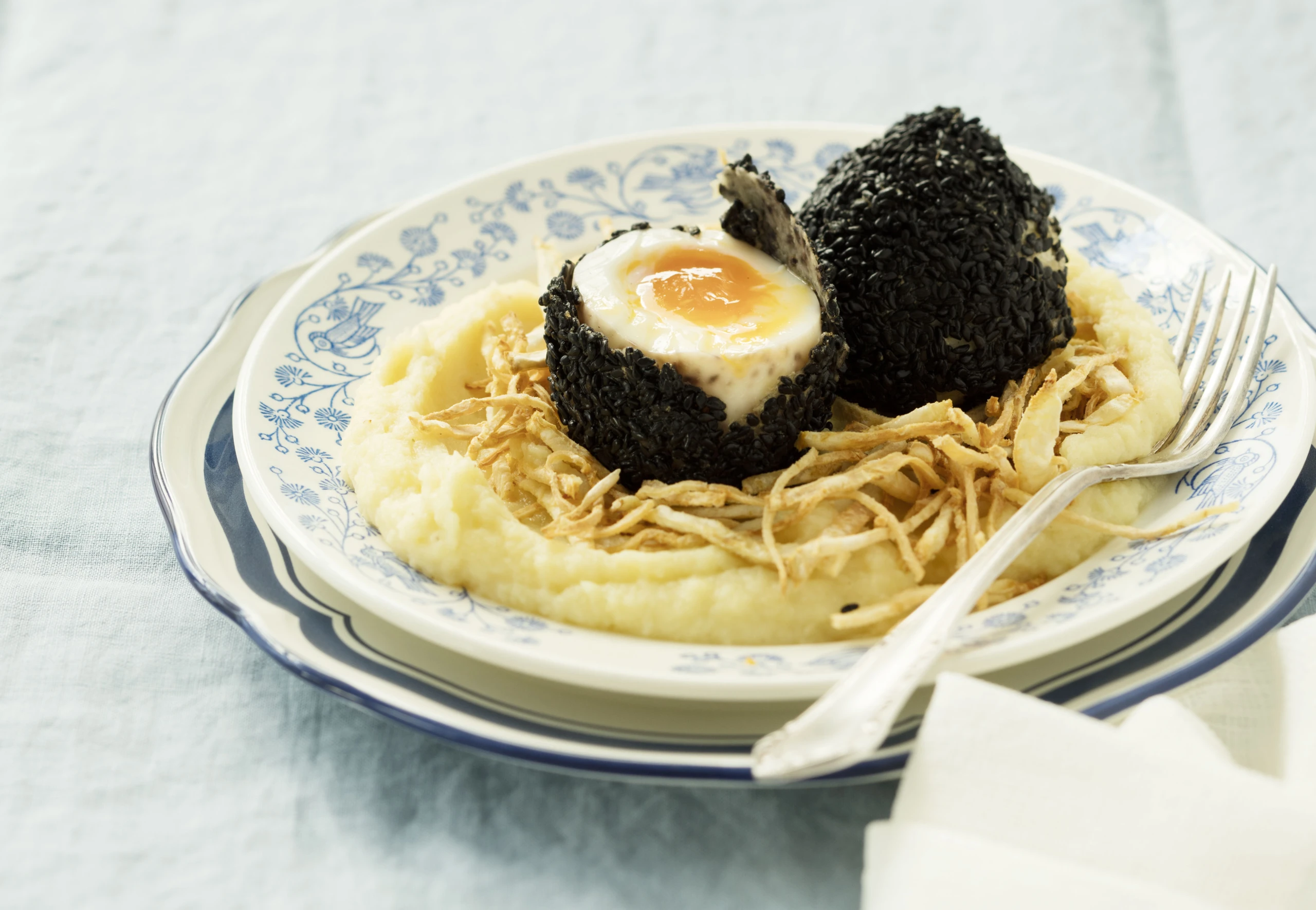 Eier im Mehl, den Eiern und Sesam panieren, im Öl 1 Minute backen und auf Küchenpapier abtropfen lassen. Eier mit Püree und Selleriestreifen anrichten.