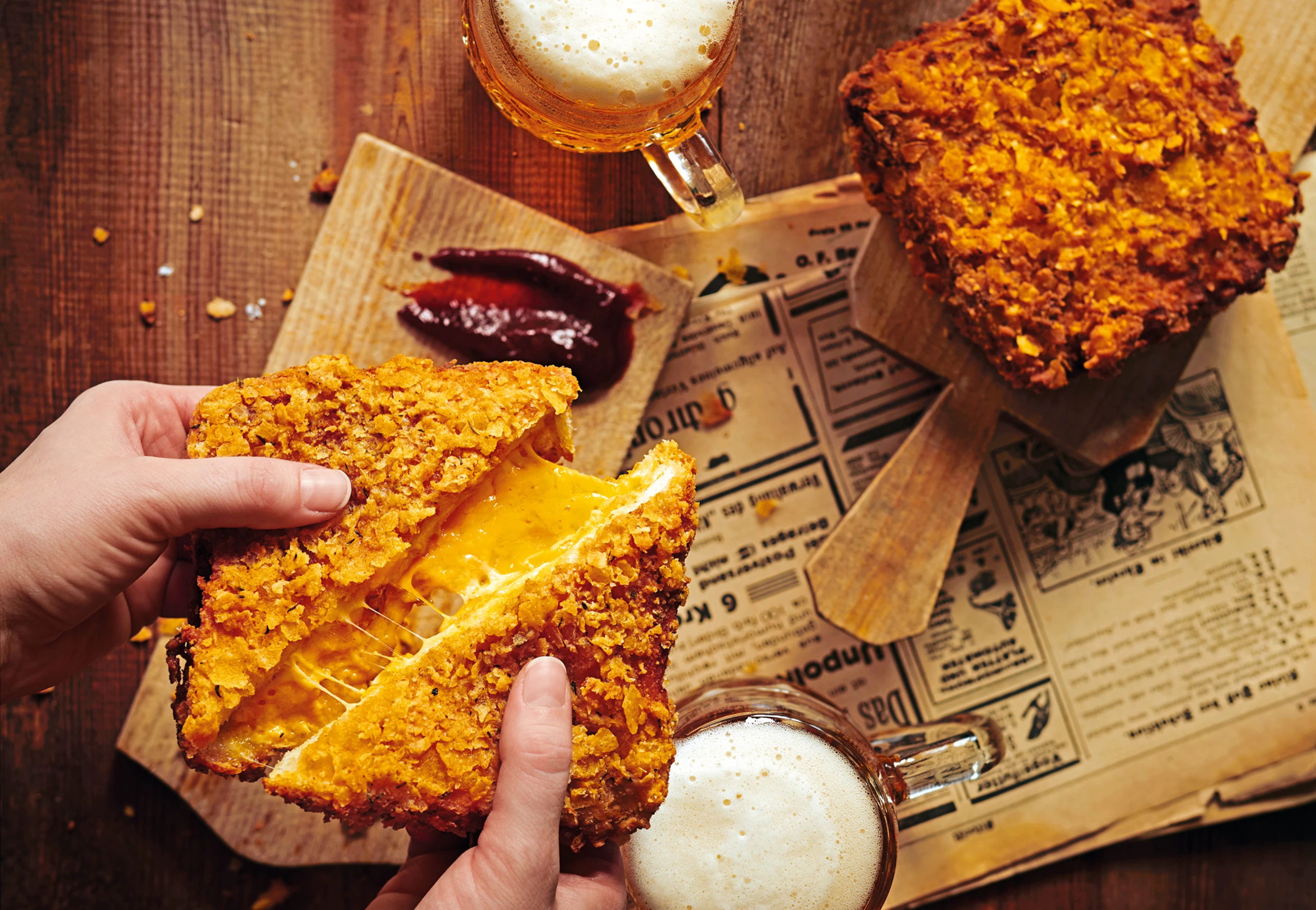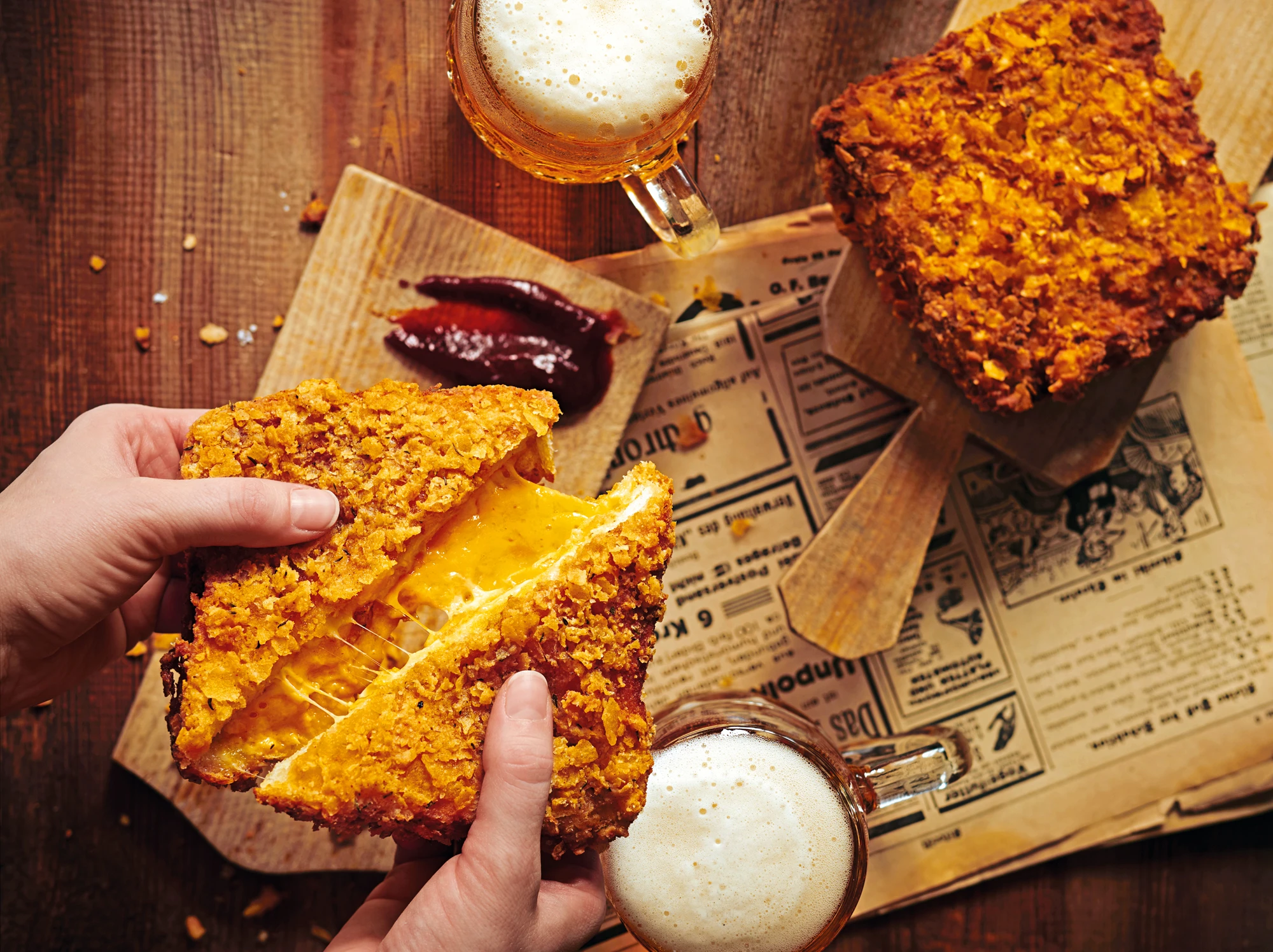 Sandwiches im heißen Öl goldbraun frittieren. Herausnehmen, auf Küchenpapier abtropfen lassen und warm genießen. Dazu passt Ketchup oder BBQ-Sauce.