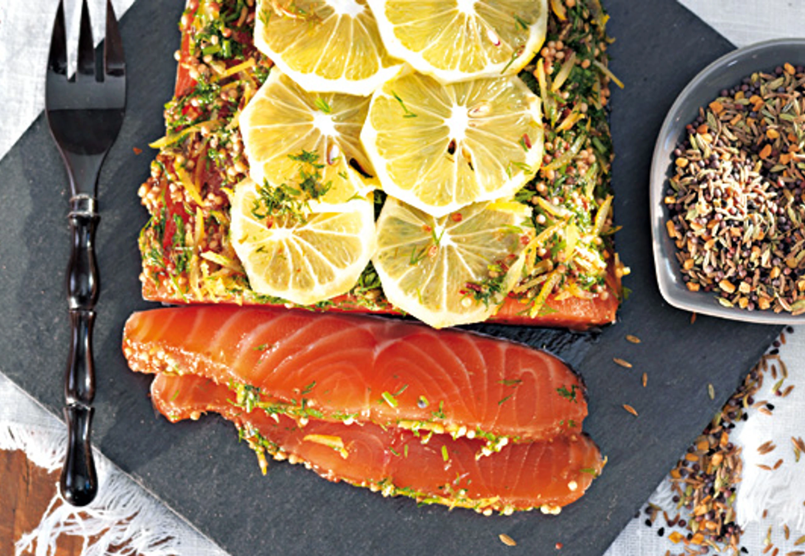 Lachsfilet auf der Fleischseite mit der Gewürzmischung bestreuen, mit Dille und Zitronenscheiben belegen und in Frischhaltefolie wickeln. In eine Schüssel geben und 12 Stunden auf der Hautseite liegend im Kühlschrank ziehen lassen. Filet umdrehen und weitere 12 Stunden ziehen lassen.