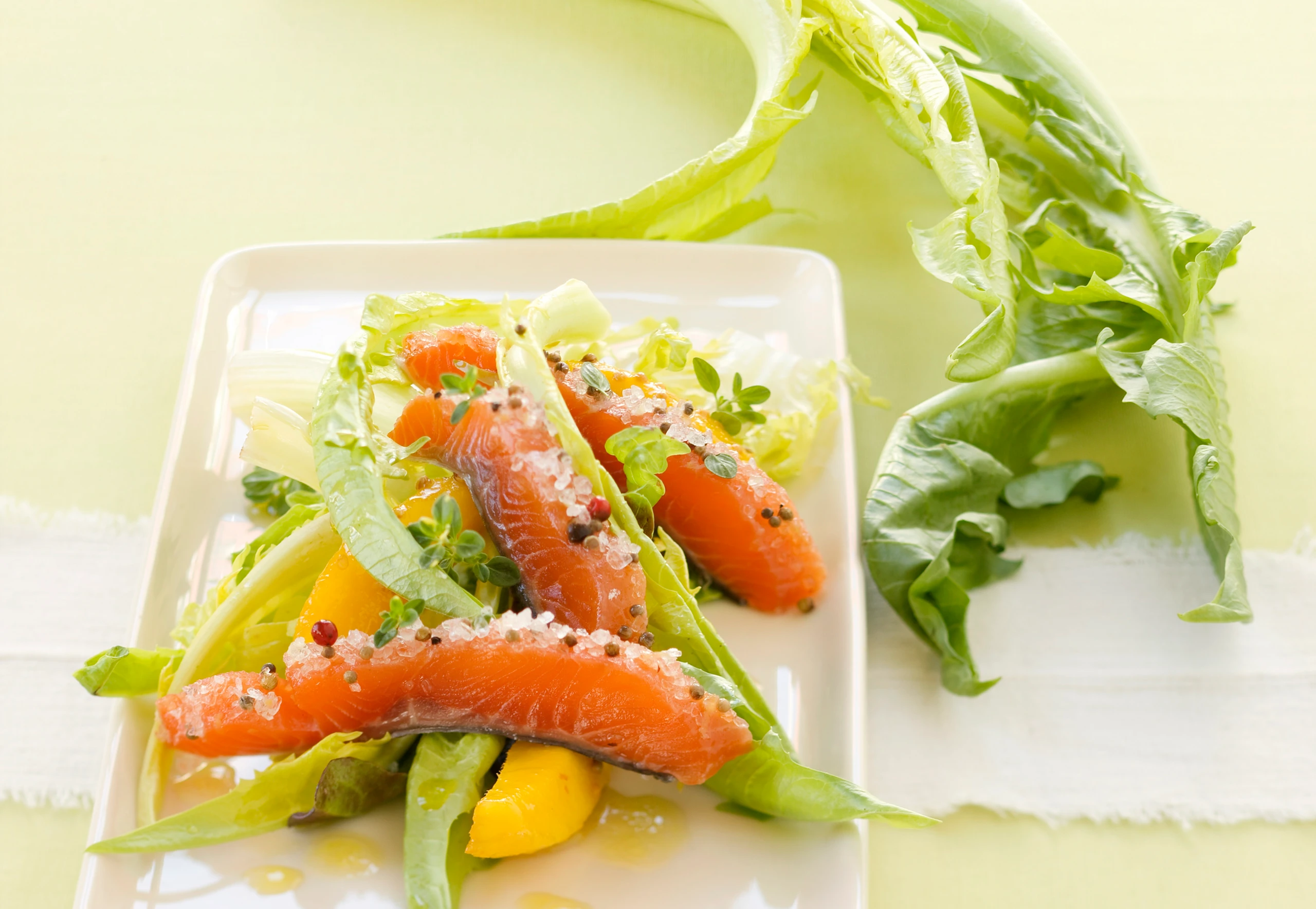 Gebeizter Lachs mit Mango und Löwenzahnsalat