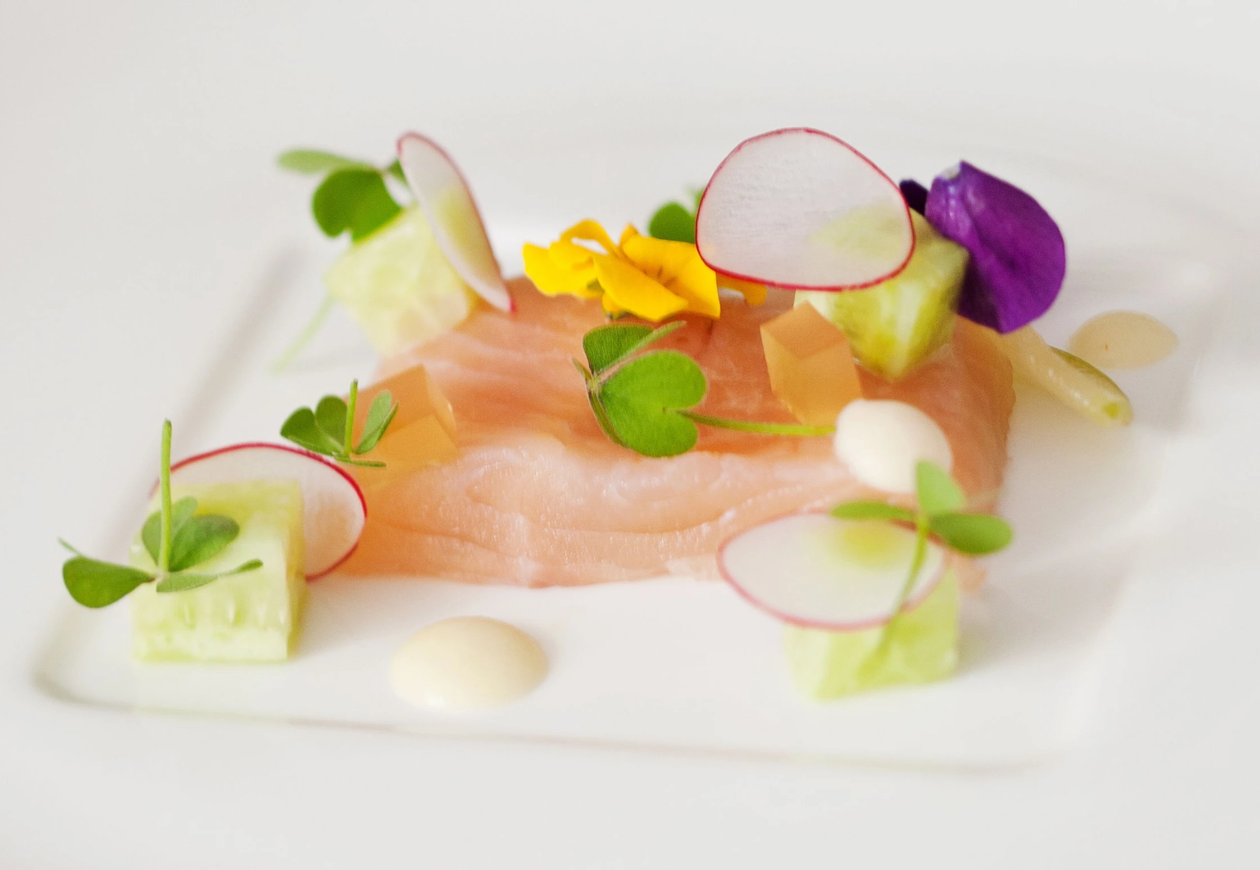 Saiblingsfilets auswickeln, portionieren und mit der Marinade, Ricottacreme und Garnitur anrichten. Eventuell mit Sauerklee, Veilchenblättern und Apfelgelee garnieren.