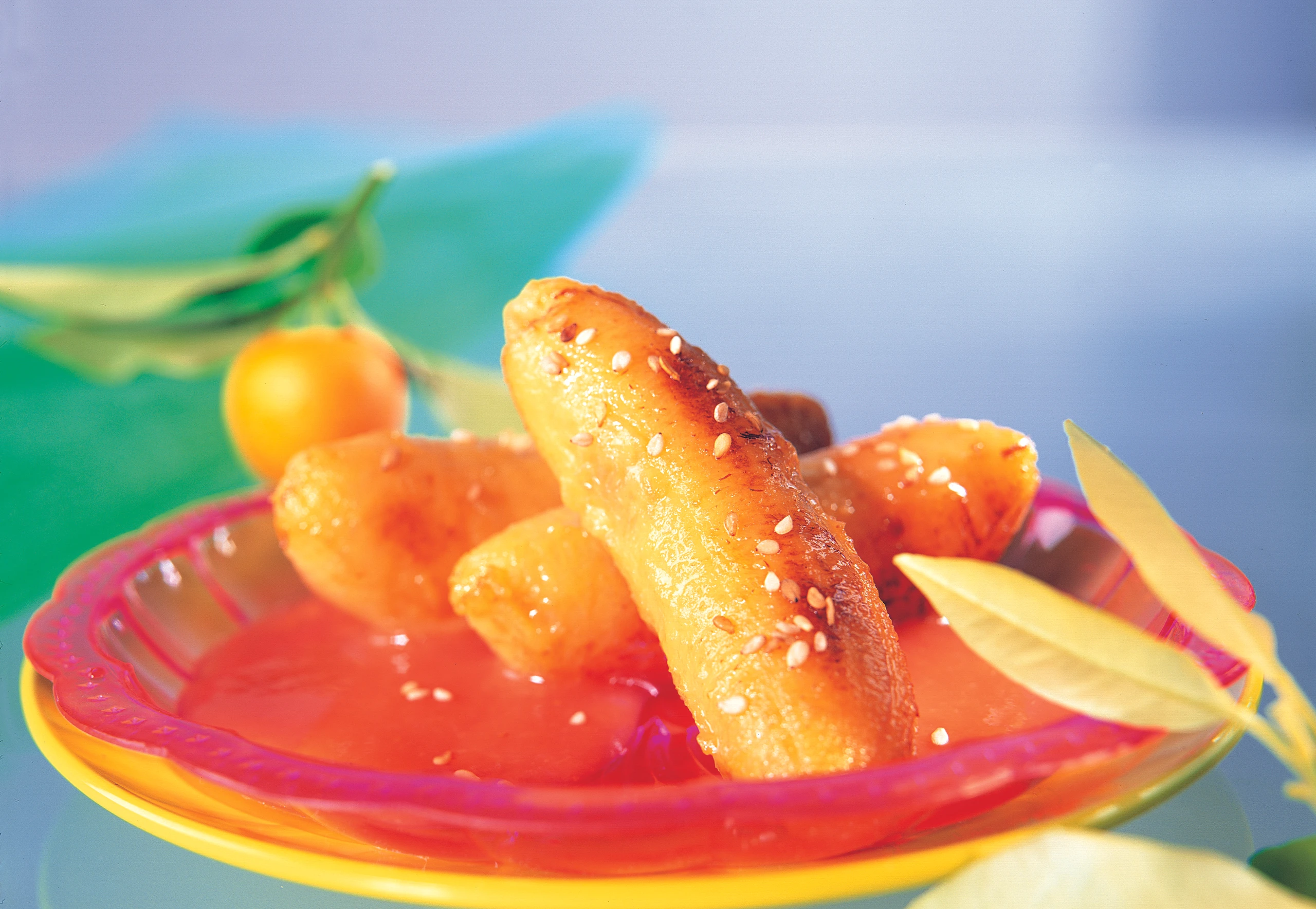 Bananen längs halbieren. Butter in einer beschichteten Pfanne erhitzen. Bananen darin auf beiden Seiten ca. 2 Minuten braten. Bananen mit Mandarinensauce servieren.