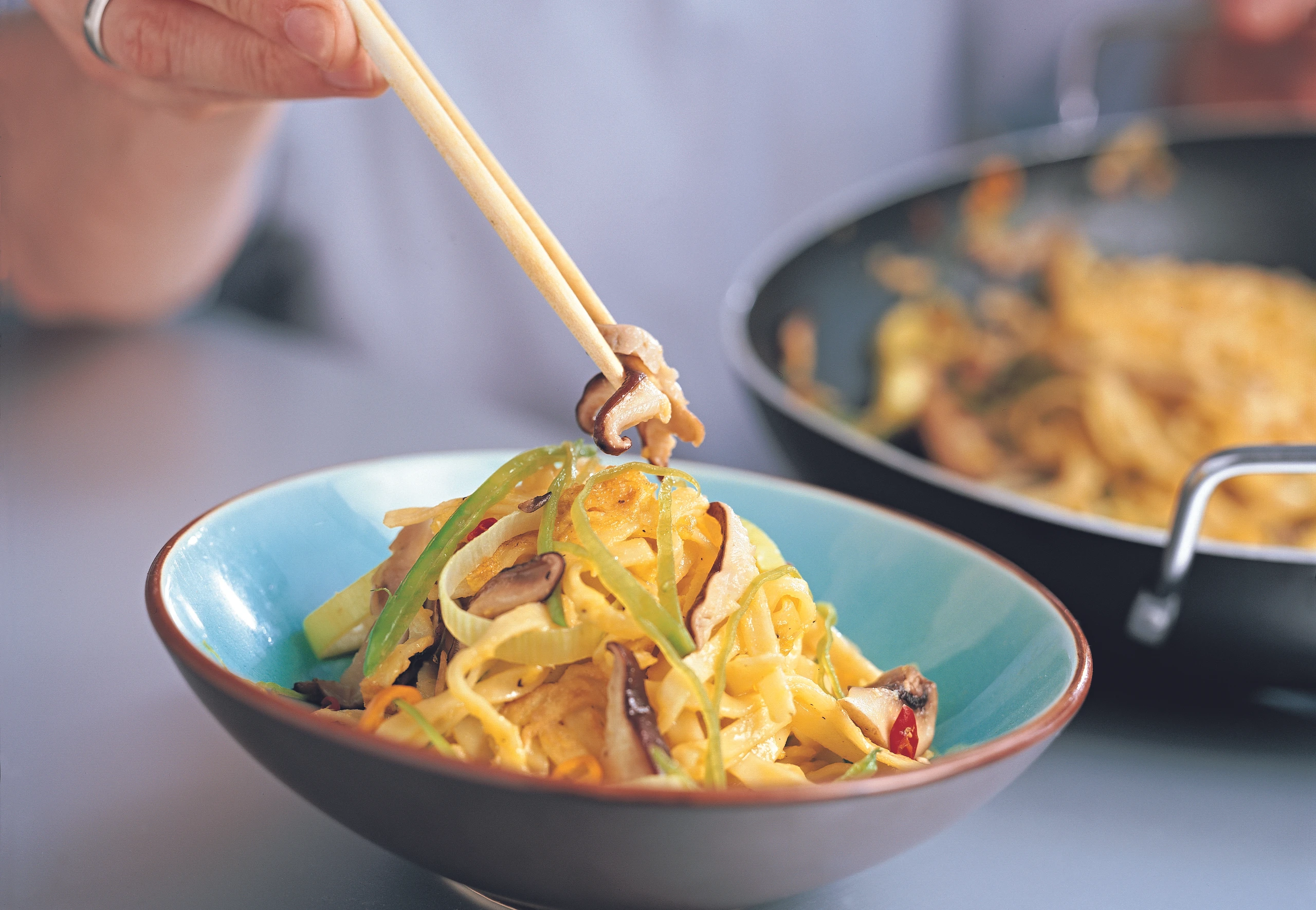 Nudeln an den Rand schieben, Gemüse und Pilze in der Pfanne braten. Zuletzt alles vermischen. Salzen, pfeffern, in Schüsseln servieren.