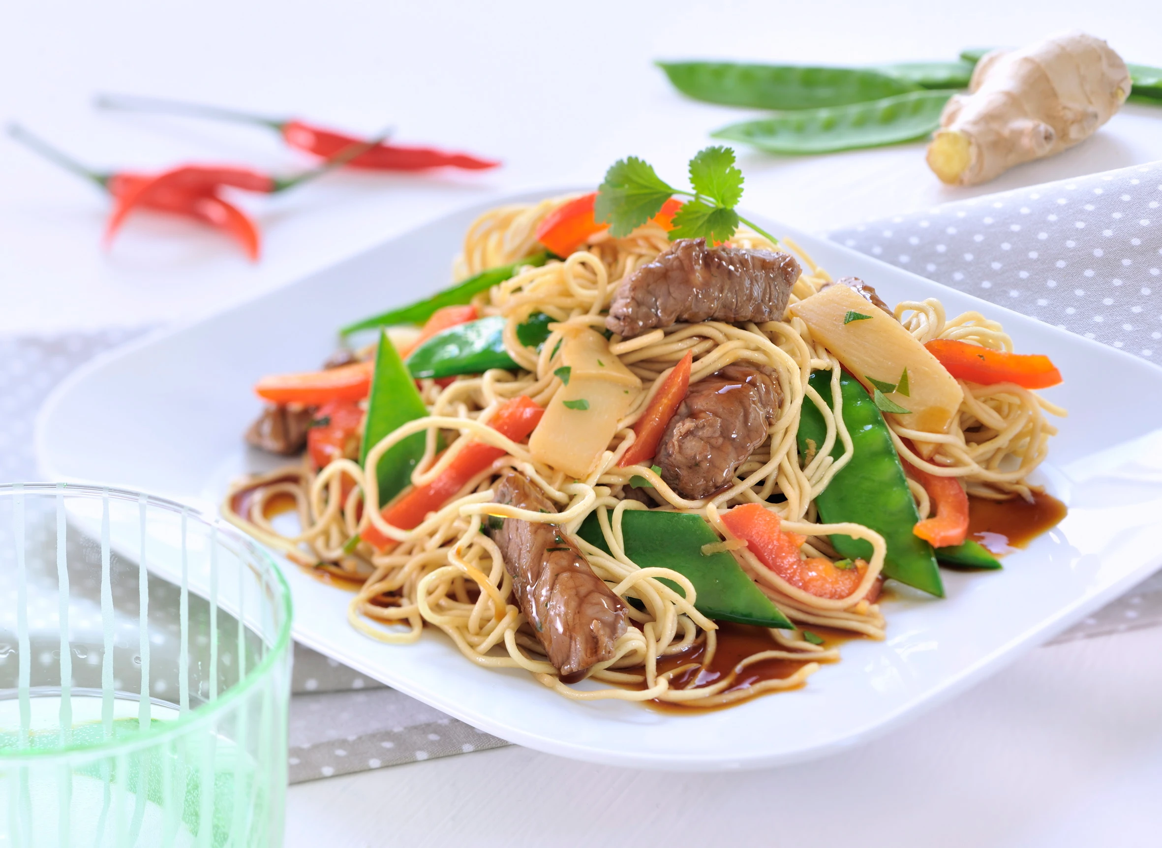 - Im Bratrückstand Erbsenschoten, Paprika, Ingwer, Chili und Bambussprossen anbraten, mit Salz, Pfeffer und Sojasauce würzen. Nudeln, Fleisch und Koriander untermischen und kurz ziehen lassen. Nudeln anrichten.